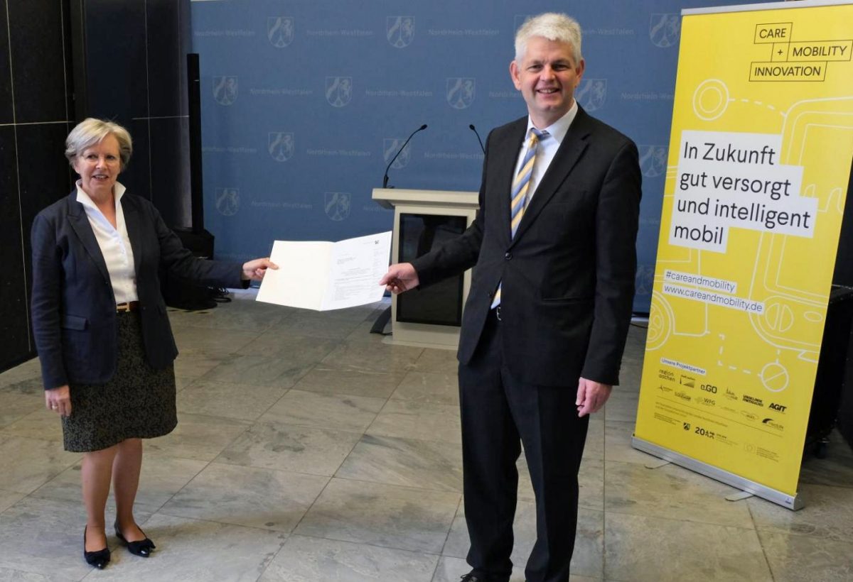 Euskirchen, 13.10.2020 – Für das Projekt „Care and Mobility Innovation“ hat Christoph Dammermann, Staatssekretär im Wirtschafts – und Digitalministerium, den Zuwendungsbescheid im Gesamtvolumen von rund 2,5 Millionen Euro an Prof. Christiane Vaeßen, Geschäftsführerin der Region Aachen – stellvertretend für das Projektkonsortium – offiziell überreicht. Das ist auch eine gute Nachricht für den Kreis Euskirchen, der ebenfalls Projektpartner ist und wo es bereits erste Initiative in diese Richtung gibt. So haben die Stiftung Evangelisches Alten- und Pflegeheim in Gemünd und die Gemeinschaftspraxis Dr. Franz-Josef Zumbé bereits einen „Letter of Intent“ unterschrieben und erste innovative Schritte in die Wege geleitet. Die lokale „Kick-off-Veranstaltung“ findet am 10. Dezember in der ehemaligen Eifelhöhenklinik in Marmagen statt.