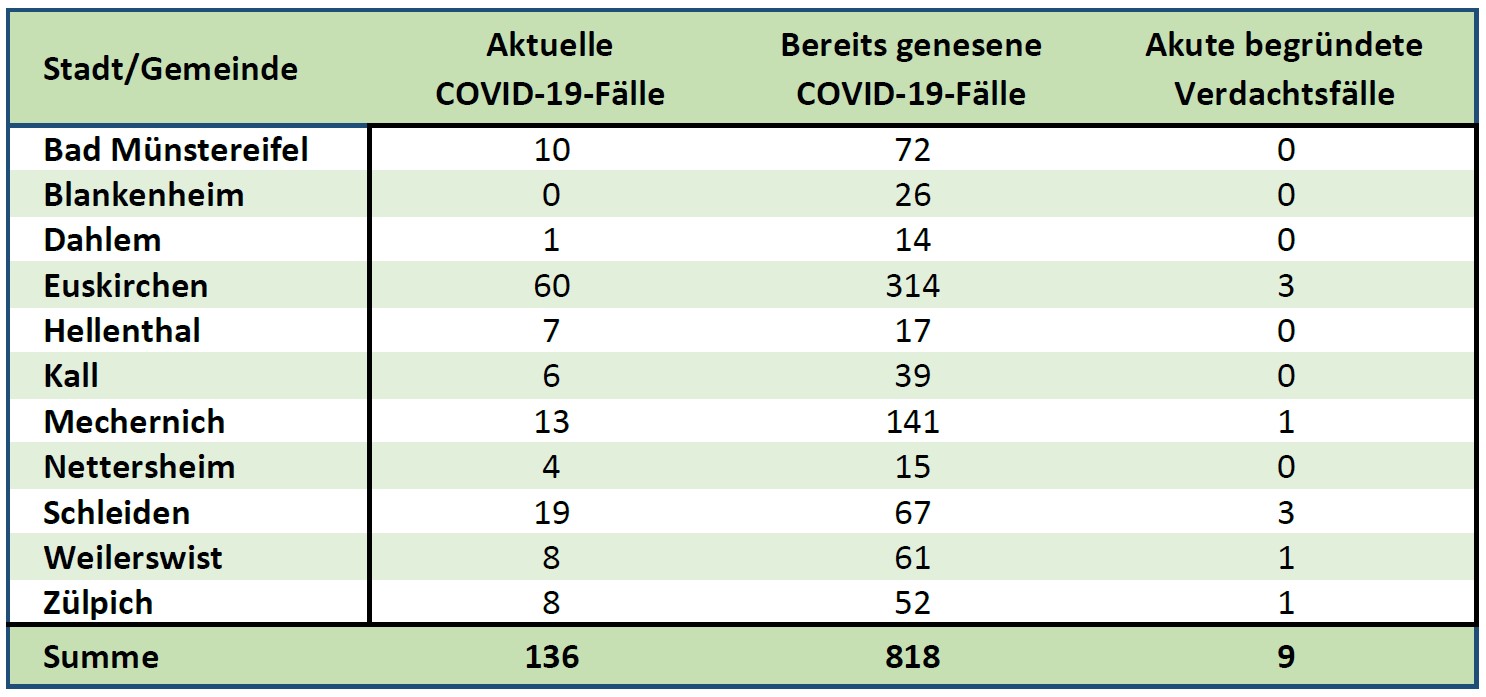 - Die Inzidenz (neue bestätigte COVID-19-Fälle in den letzten 7 Tagen je 100.000 Einwohner) beträgt 60,8 (51,0).Die Fallzahlen nach Kommunen: