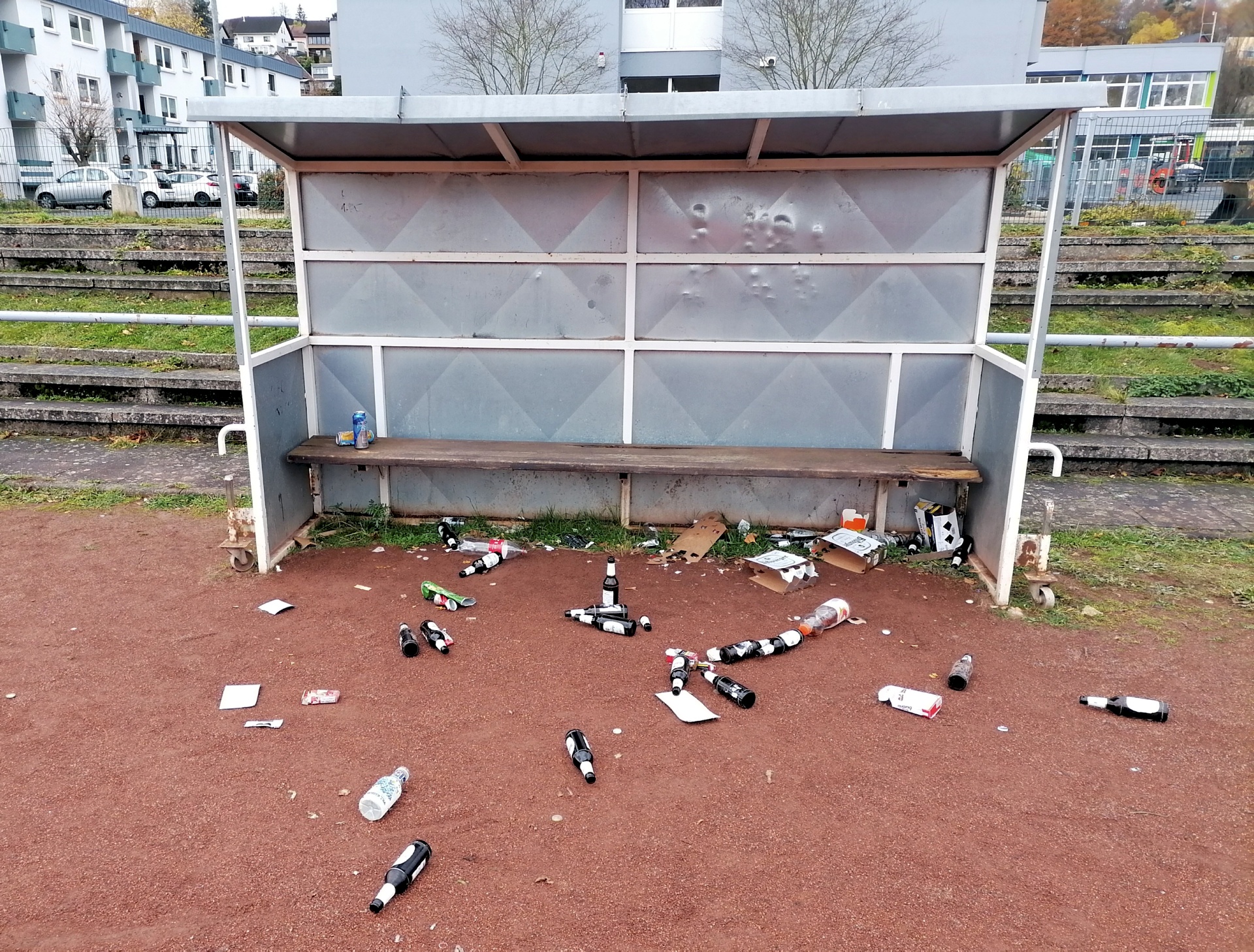 Hinzu kommen noch deutliche Spuren von Zusammenkünften, die darauf deuten, dass auch gegen die Corona-Verordnung verstoßen wurde. In der Grillhütte „Auf dem Fels“ sowie im Bereich des Kaller Sportplatzes (Trainerbank, Treppe zur Urft) fand das Ordnungsamt jede Menge liegen gelassenes Leergut und Müll.