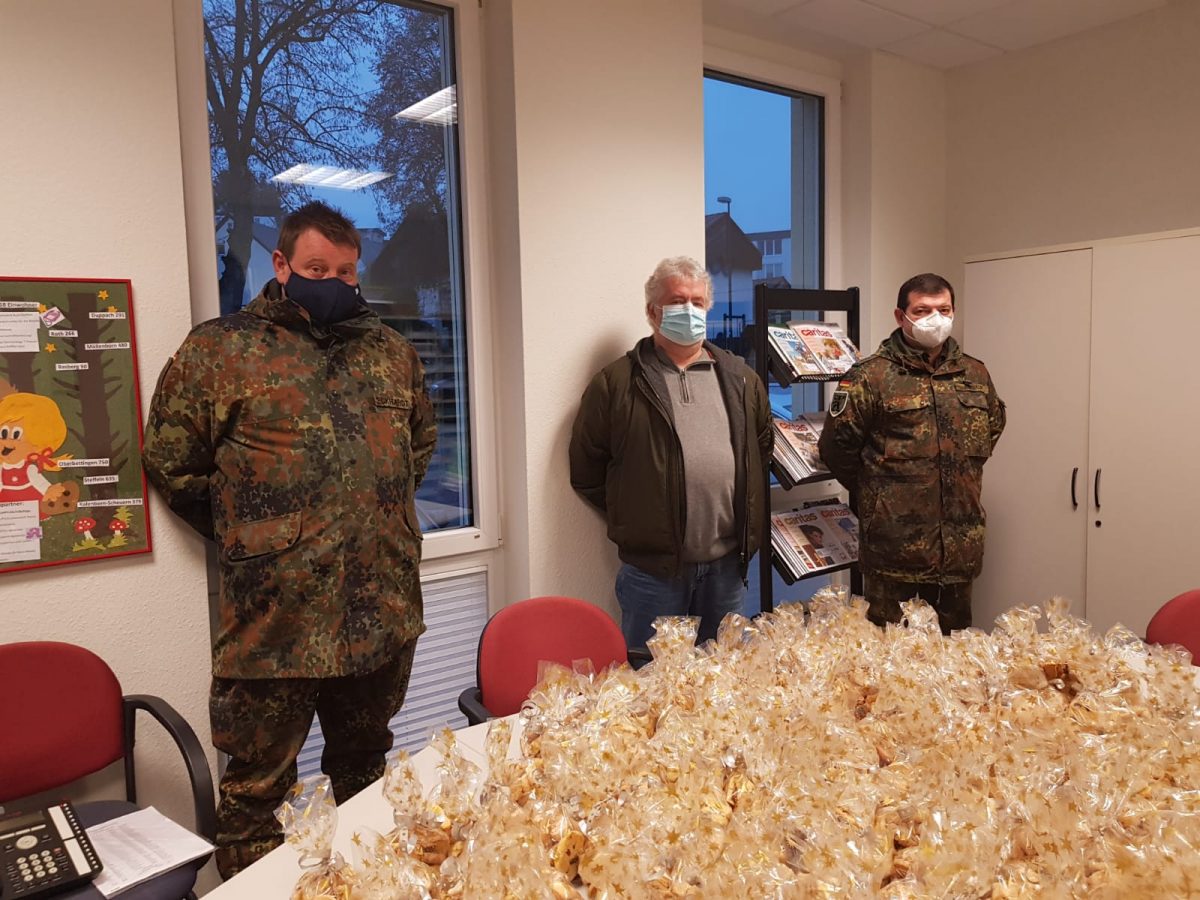 Gerolstein, 10.12.2020 – Was für eine wunderschöne adventliche Geste der Reservisten. Sie brachten über 200 Tütchen, gefüllt mit leckerem Weihnachtsgebäck zur Caritas-Sozialstation. Die haben alles selbst gebacken und dann sehr schön verpackt. Von dort aus wurden sie zum Nikolaustag von den Pflegefachkräften an die betreuten Patienten verteilt.