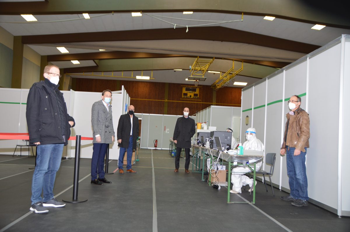 Mayen, 15.12.2020 – Kürzlich verschaffte sich Oberbürgermeister Dirk Meid gemeinsam Staatssekretär Clemens Hoch aus der Staatskanzlei sowie dem Landtagsabgeordneten Marc Ruland einen persönlichen Eindruck von der Corona-Ambulanz in der Weiersbach.
