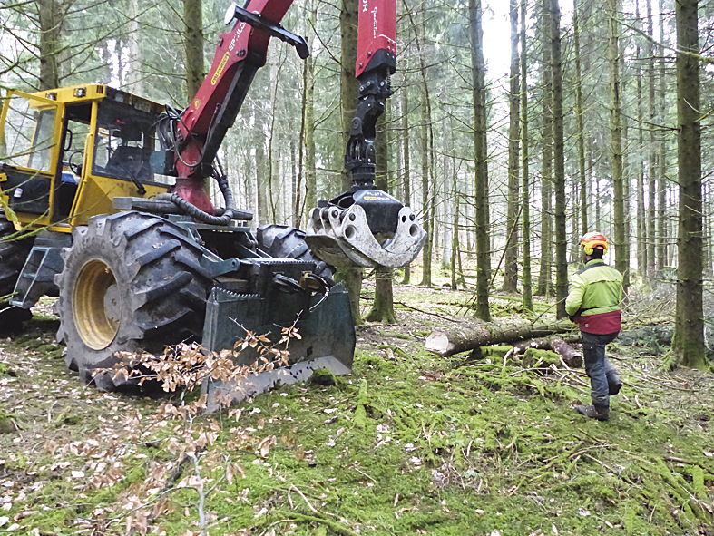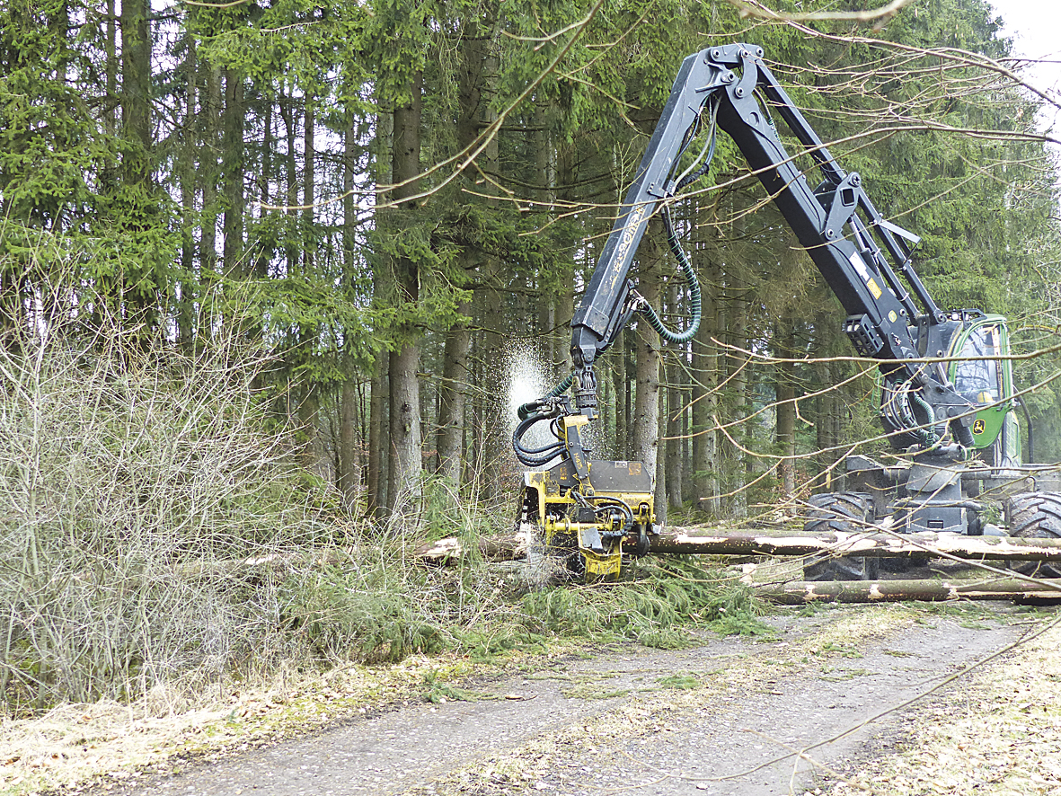 Der Leiter des Forstamtes Gerolstein, Michael Schimper: „Daher sind wir auf die Mitarbeit von zahlreichen Forstunternehmern angewiesen. Alleine in unserem Forstamt arbeiten derzeit 9 Harvester“. In nassen Bereichen werden die Bäume direkt am Weg mit einem Harvester verarbeitet. Foto: Landesforsten RLP / Martin Lotze