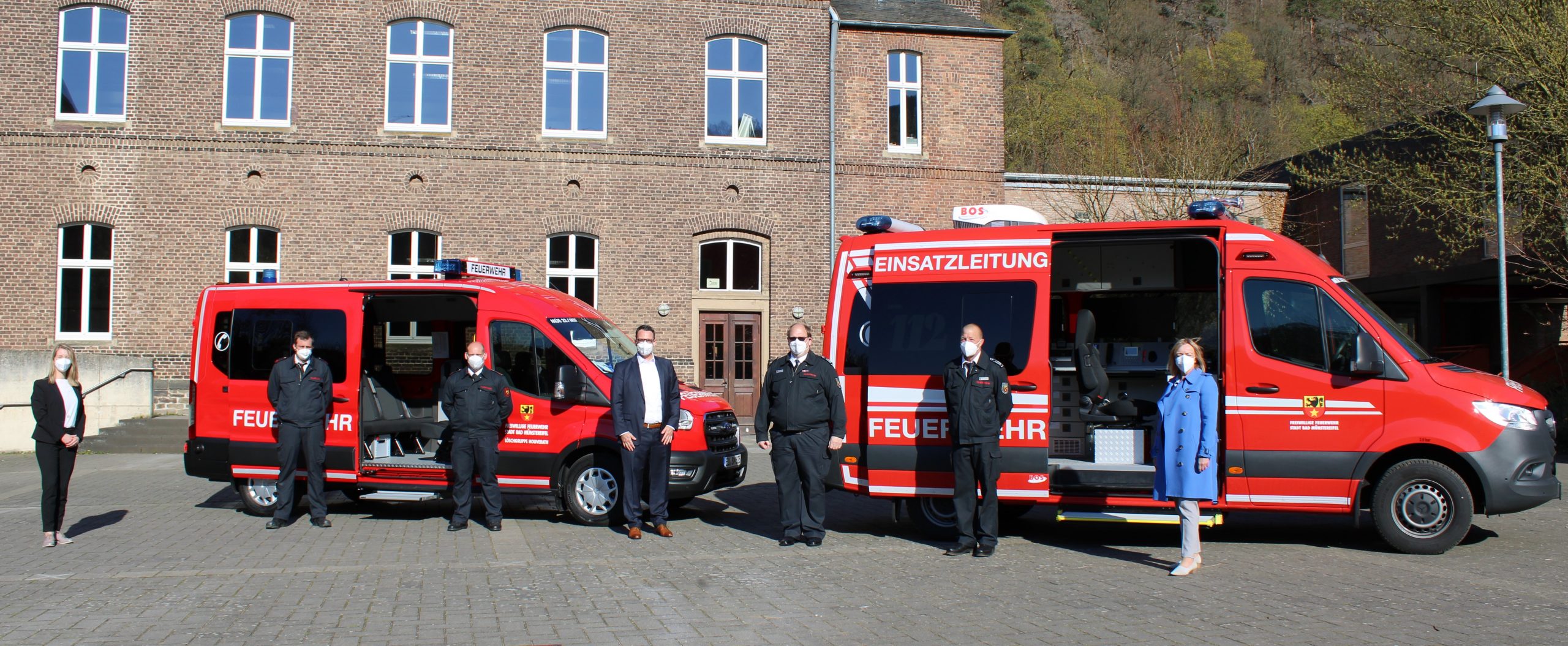 Bad Münstereifel – Bürgermeisterin Sabine Preiser‑Marian übergab am 27.04.2021 vor der Sitzung des Bau- und Feuerwehrausschusses im Beisein des Ausschussvorsitzenden Herrn Florian Hammes, dem Leiter der Feuerwehr Bad Münstereifel Herrn André Zimmermann und dessen Stellvertreter Herrn Thomas Bauerfeind, der Amtsleiterin für öffentliche Sicherheit und Ordnung, Soziales Frau Gina Burgwinkel-Ernst, den Feuerwehrkameraden Herrn Steffen Seehafer und Herrn Kai Nolden, offiziell zwei neue Feuerwehrfahrzeuge an die Feuerwehr Bad Münstereifel.