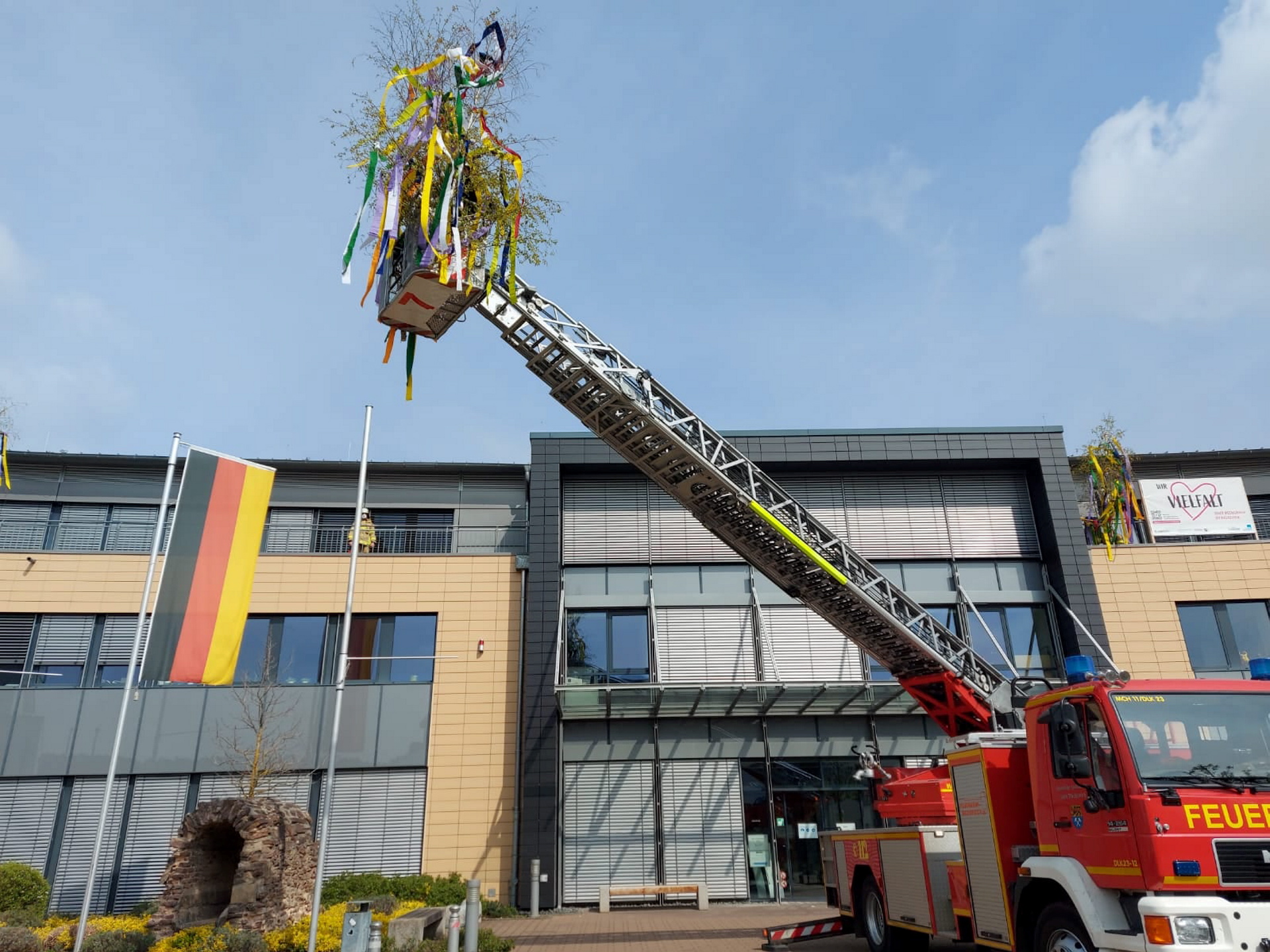 Die Freiwillige Feuerwehr Mechernich befestigte mit einem Drehleiter-Fahrzeug am 1. Mai bunt geschmückte Maibäume am Mechernicher Rathaus. Foto: Niklas Rollinger/pp/Agentur ProfiPress