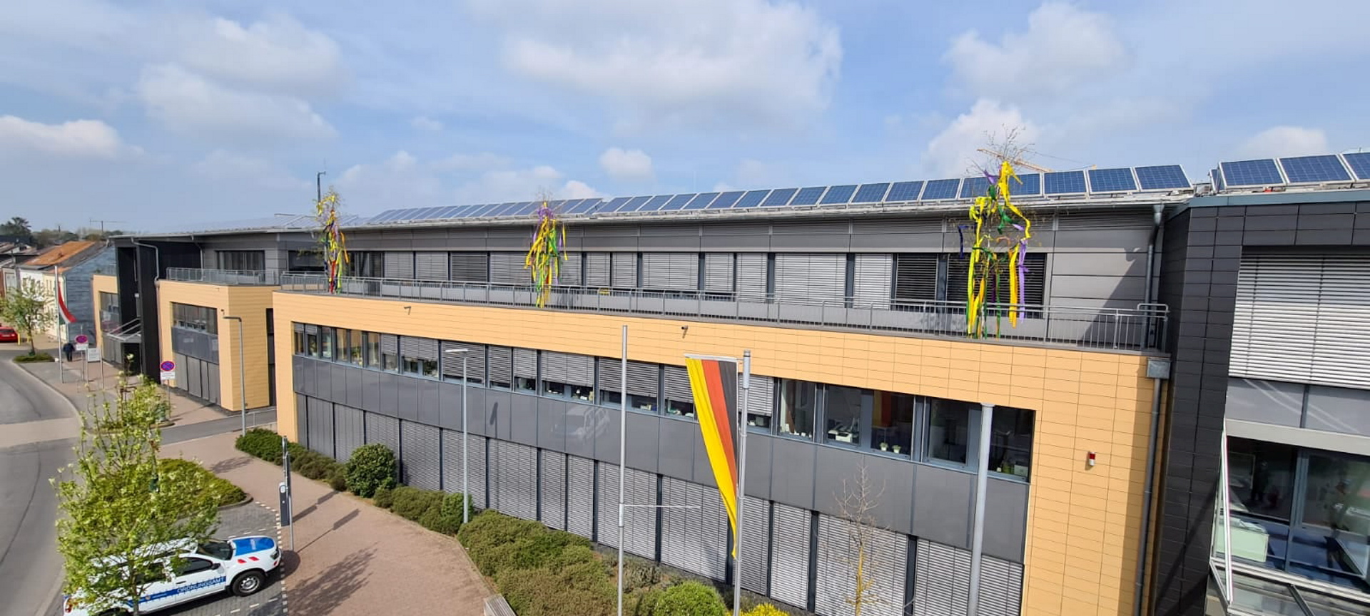 Auf der linken und rechten Seite der Front des Mechernicher Rathauses wurden jeweils drei kleine Maibäume an den Geländern des Balkons befestigt. Foto: Niklas Rollinger/pp/Agentur ProfiPress