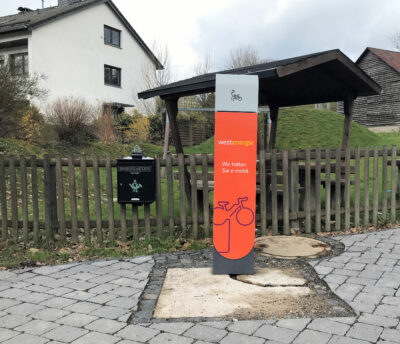 Westenergie stellt den Städten und Gemeinden in NRW, Rheinland-Pfalz und Niedersachsen inzwischen eine neue Generation von eBike-Ladesäulen zur Verfügung. Über drei Doppelsteckdosen und sechs USB-Anschlüsse können hier sechs eBikes oder eScooter sowie Smartphones, Laptops oder Powerbanks Strom geladen werden, und zwar gleichzeitig. Die drei LED-beleuchteten Stau- und Ladefächer verfügen außerdem über eine Kabeldurchführung nach außen, so dass auch ein direktes Laden am eBike oder eScooter möglich ist, ohne den Akku entnehmen zu müssen. Die Ladesäule ist rund 1,40 Meter hoch und in massiver Stahl-Aluminium-Bauweise gefertigt. Ein spezieller Lack schützt sie vor Korrosion.