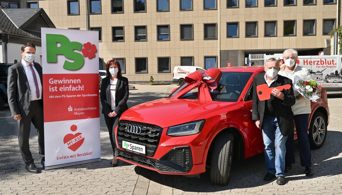 Mayen/Region – Albert Wagner aus Mendig gewinnt beim PS-Sparen der Kreissparkasse Mayen. Albert Wagner aus Mendig staunte nicht schlecht, als er vor einigen Tagen von seiner Kundenberaterin des KSK-BeratungsCenters in Mendig darüber informiert wurde, er habe mit einem seiner Lose beim PS-Sparen der Sparkassen ein nagelneues Auto gewonnen. „Ein Gewinn, denn wir normalerweise eher selten übergeben dürfen, nun aber innerhalb weniger Wochen bereits zum dritten Male im Kreise unserer Kunden“, freut sich KSK-Kundenberaterin Alexandra Priwitzer gemeinsam mit dem Gewinner Albert Wagner und seiner Frau Renate Porz bei der offiziellen Gewinnübergabe auf dem Kundenparkplatz vor dem BeratungsCenter in der St.-Veit-Straße in Mayen. Gemeinsam mit Vertriebsleiter Alexander Müller gratulierte Alexandra Priwitzer dem glücklichen Gewinner, der seit knapp 20 Jahren am PS-Sparen teilnimmt, mit einem Blumenstrauß zu seinem Gewinn und übergab symbolisch den „großen“ Autoschlüssel zum neuen Fahrzeug.