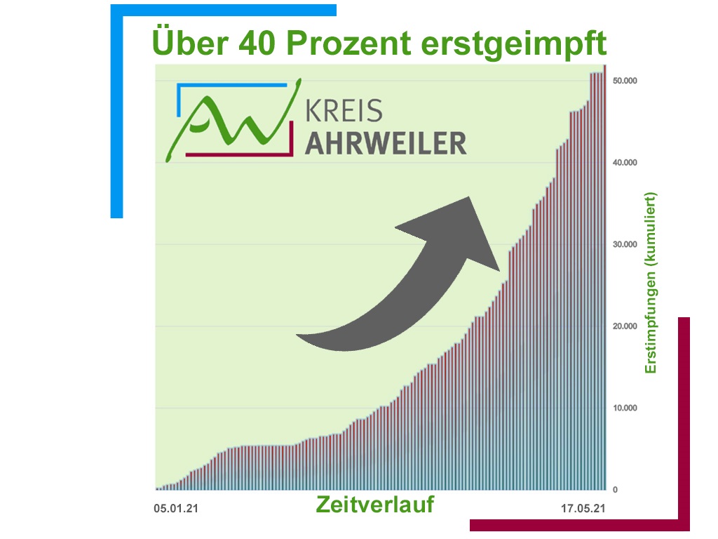 Seit dem Start der Impfkampagne vor 132 Tagen sind mehr als 71.000 Corona-Schutzimpfungen (51.979 Erst- sowie 19.103 Zweitimpfungen) im Kreis Ahrweiler durchgeführt worden. Mit einer Erstimpfquote von 40 Prozent liegt der Kreis somit weiterhin über dem Landesdurchschnitt von 35,3 Prozent sowie dem Bundesdurchschnitt von 37 Prozent. Die Quote der Zweitimpfungen beträgt im Kreis 14,7 Prozent und liegt damit ebenfalls deutlich über der des Landes (12,9 Prozent) und des Bundes (11,2 Prozent).