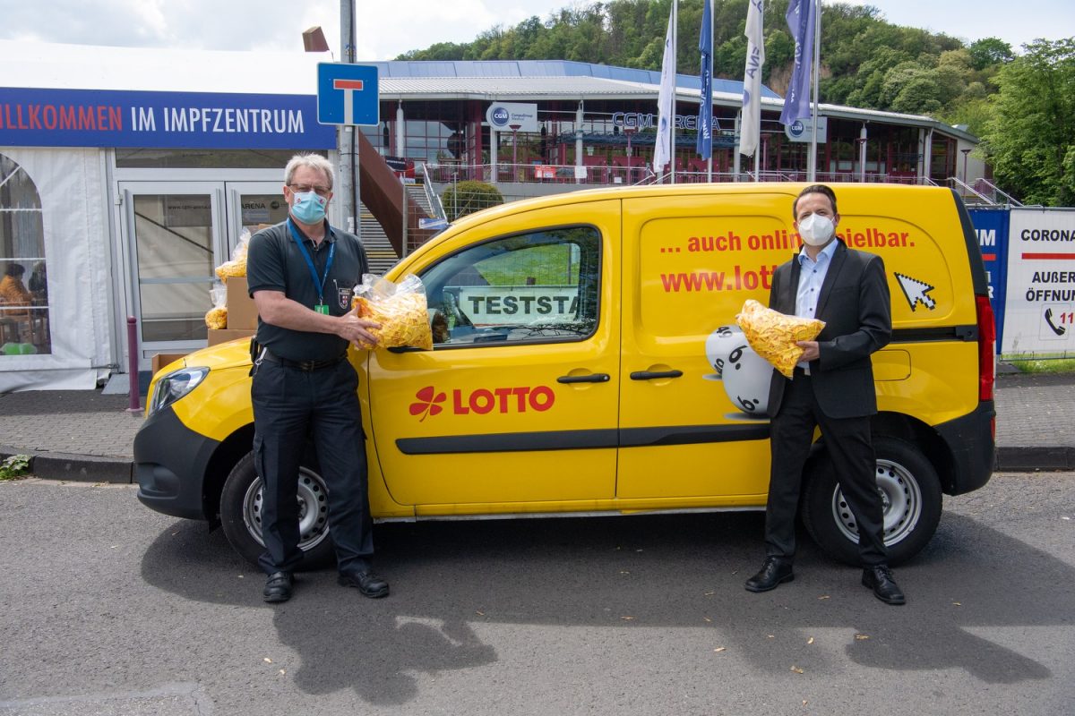 „Damit möchten wir zum einen den unzähligen Helferinnen und Helfern in den Impfzentren einen kleinen Energieschub zwischendurch ermöglichen, aber auch den vielen impfwilligen Menschen den Pieks versüßen“, sagte Lotto-Marketingleiter Steffen Heidorn bei der Übergabe an Olav Kullak, den Koordinator des Impfzentrums Koblenz.