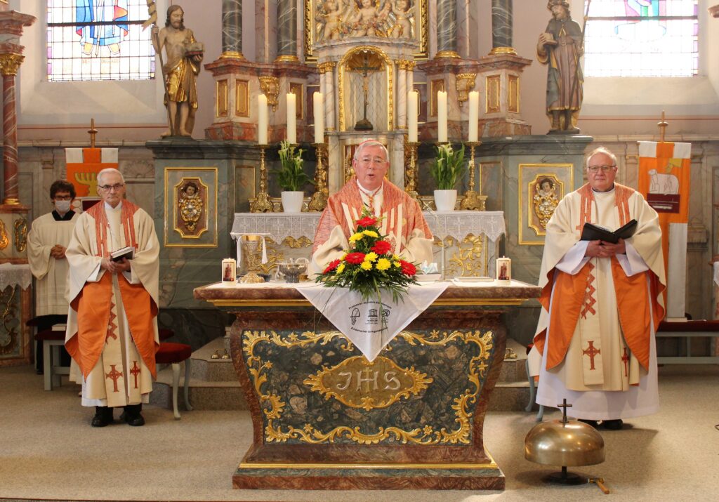 Aufgrund der anhaltenden Corona-Pandemie mussten die Fußwallfahrt als auch die Springprozession selbst in Echternach bereits zum zweiten Mal in Folge abgesagt werden. Wie im vergangenen Jahr feierte Kardinal Hollerich, gemeinsam mit Pfarrer Georg Josef Müller aus Waxweiler und Ordensprälat Friedrich Kreutz aus Kyllburg, anstelle der Andacht eine heilige Messe mit den Brudermeistern und vielen Gläubigen in der Pfarrkirche in Waxweiler. „Der heilige Willibrord verbindet uns über die Grenzen hinaus mit Christus, mit Gottvater. Diese Verbindung steht für die Erneuerung der Kirche in Europa, die wir brauchen, ohne Angst, sondern mit Zuversicht.“, so der Kardinal in seinen begrüßenden Worten.