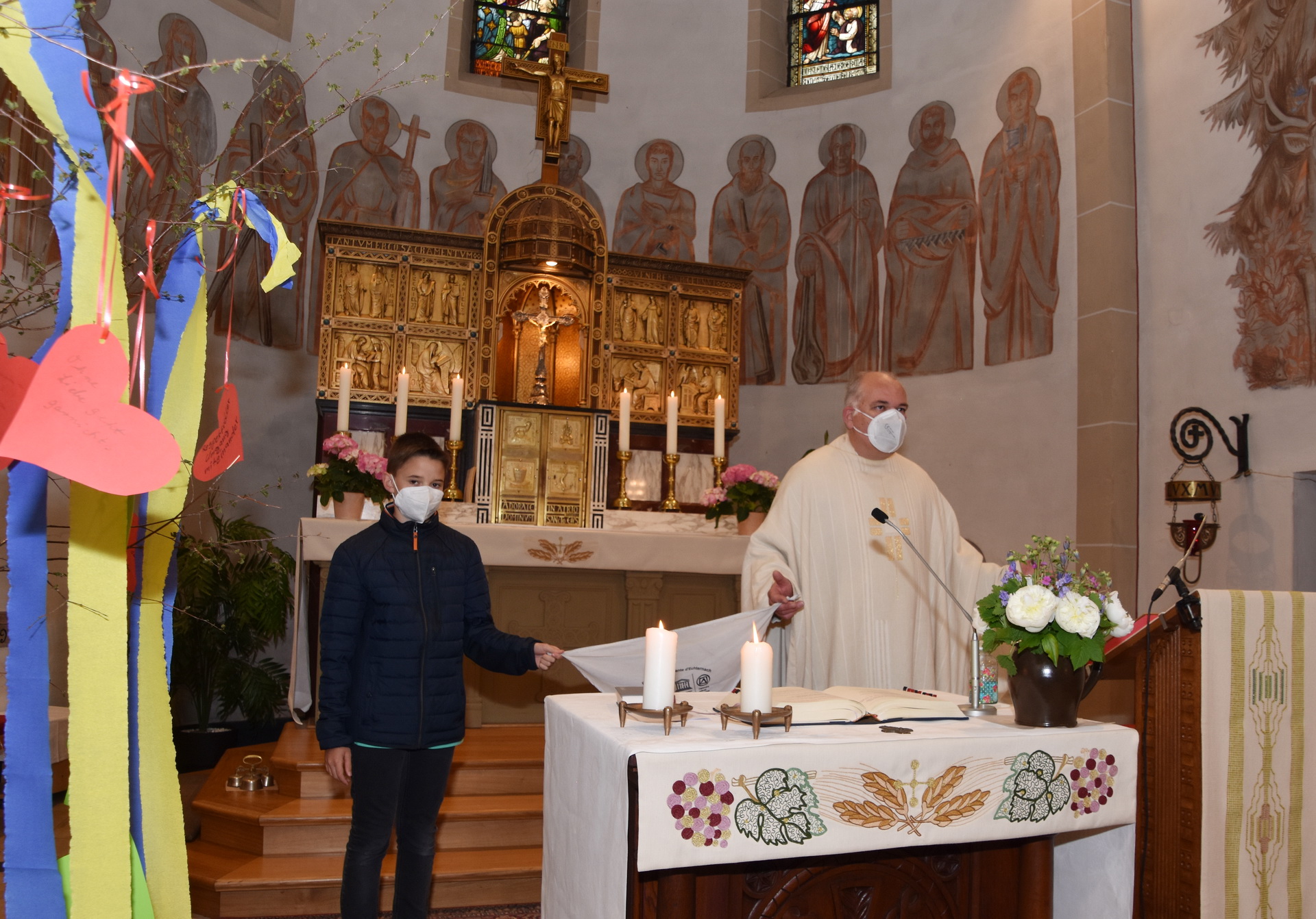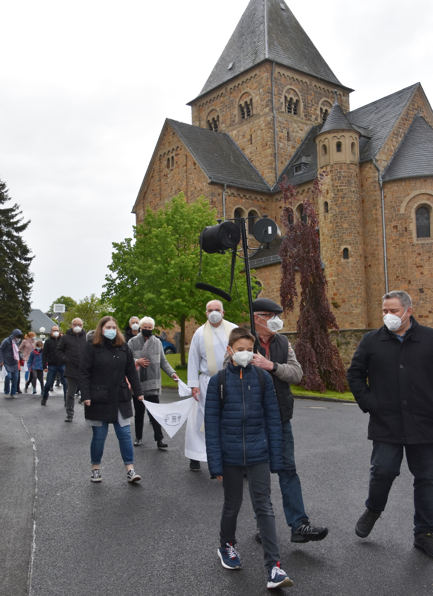 Die Gottesdienstgemeinde darf zurzeit nicht am Gesang teilnehmen und musste auf Sicherheitsabstände in den Kirchenbänken – und auch bei der Springprozession achten, was aber nicht schwerfällt, weil die Prozessionsteilnehmer auch zu normalen Zeiten weiße Tücher zwischen sich halten.