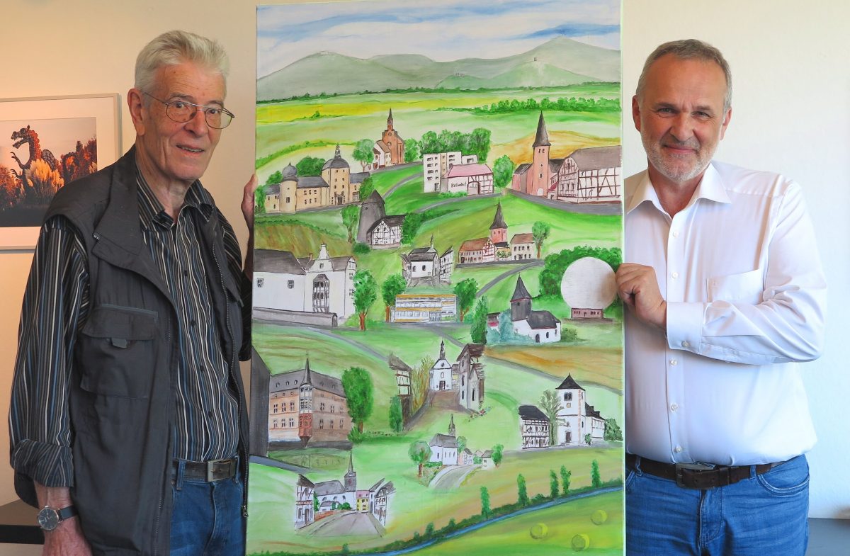 Wachtberg-Berkum (mm) – Das Zimmer von Bürgermeister Jörg Schmidt im Wachtberger Rathaus ziert seit kurzem ein großes Aquarellbild mit Wachtbergs Sehenswürdigkeiten. Gemalt hat es Heiner Pilger, der schon seit vielen Jahren mit seinen Wachtberg-Motiven begeistert.