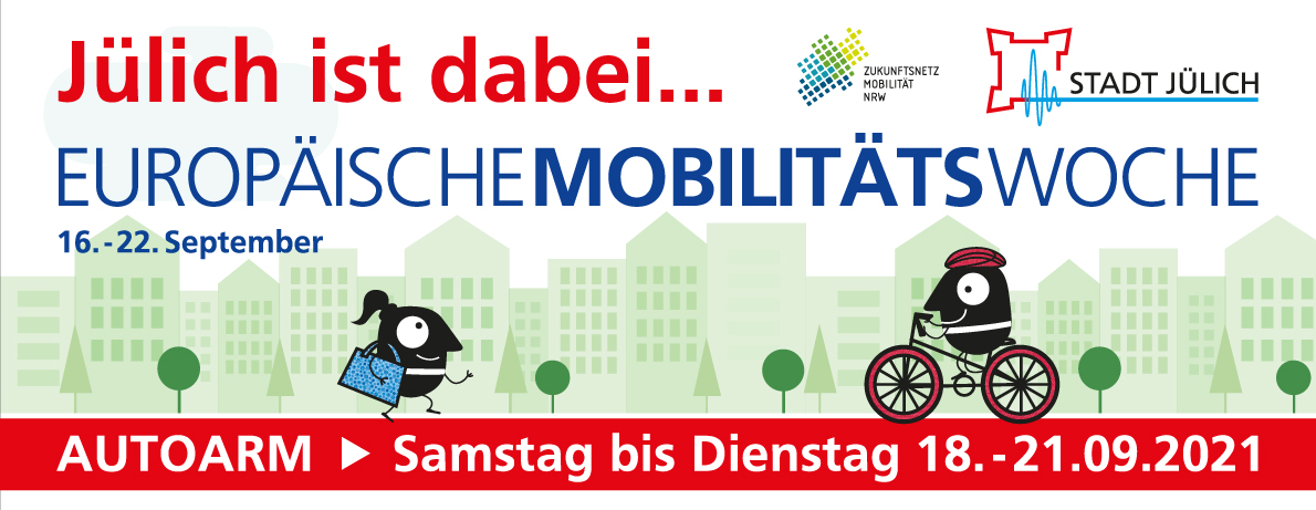 Jülich – Die Jülicher Innenstadt wird in der Zeit von Samstag, den 18.09.2021 bis einschließlich Dienstag, den 21.09.2021 für autoarm erklärt und vollständig für den Fuß- und Radverkehr geöffnet. Mit der Aktion nimmt die Stadt Jülich zum zweiten Mal an der Europäischen Mobilitätswoche (EMW) teil. Ziel der Kampagne ist es, mit Menschen vor Ort zu den Themen Sicherheit und Gesundheit im Verkehr ins Gespräch zu kommen und vor Ort zu zeigen, dass nachhaltige Mobilität die Lebensqualität für alle verbessert und es viele Möglichkeiten gibt, umwelt- und klimaschonend unterwegs zu sein.