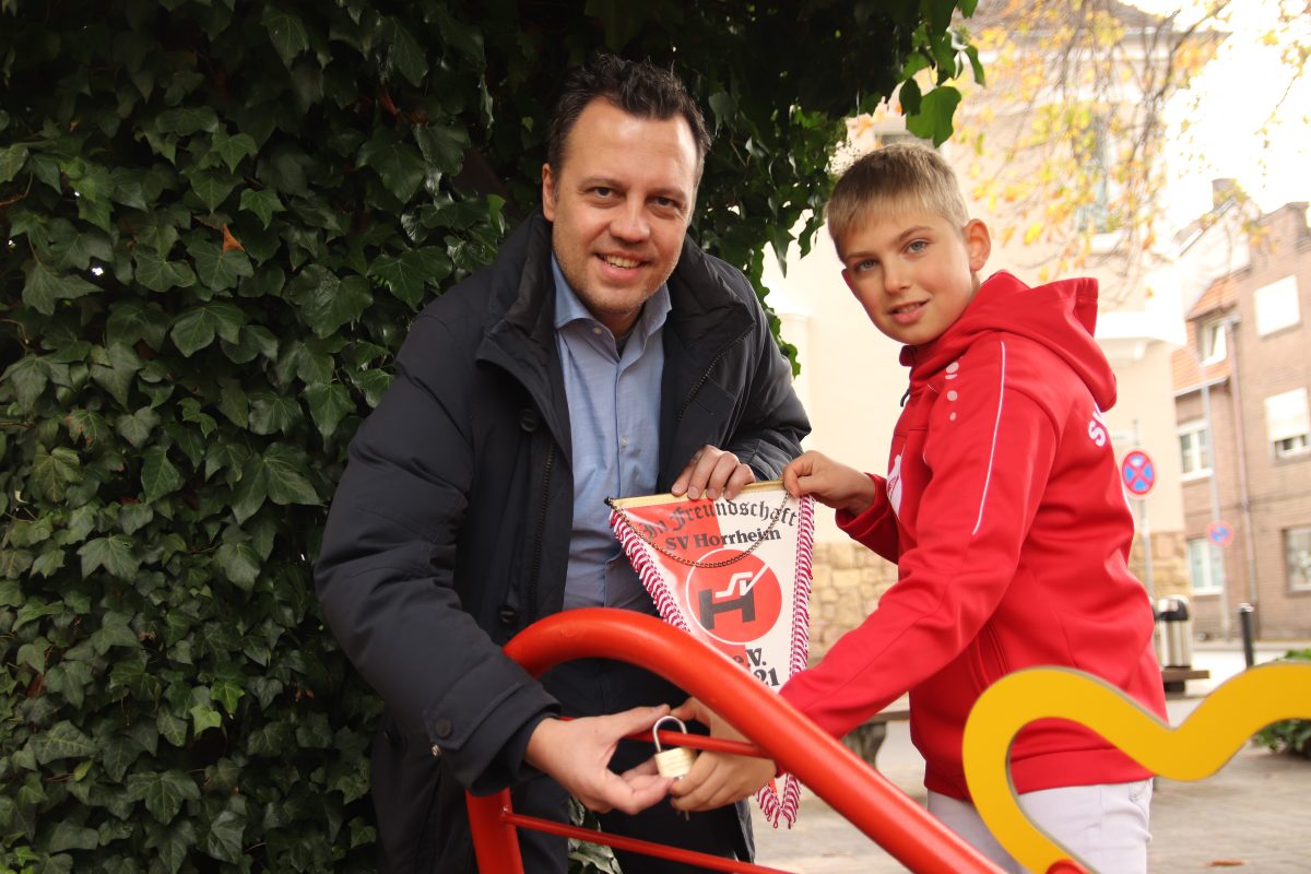 Am Samstag waren einige Mitglieder des Vereins persönlich nach Euskirchen gekommen, um die Spende am Luisenplätzchen an Bürgermeister Sacha Reichelt and Melanie Barth vom Fachbereich Schulen, Generationen und Soziales zu übergeben. Eine besondere Überraschung hatte der Verein auch noch dabei: Die Kinder und Jugendlichen aus dem Ort hatten Kinder- und Jugendbücher gespendet, die sie als Erstbestückung des Bücherschrankes zu Verfügung gestellt haben. Diese wurden von den Kindern des Vereins, die mitangereist waren, sogleich eingeräumt. Außerdem erhielt die Stadt noch spontan einen Gutschein für die Nachbeschaffung von Büchern in Höhe von 150 Euro. Bürgermeister Sacha Reichelt hängte gemeinsam mit einem der jüngsten Vertreter des Vereins das erste Vorhängeschloss an die herzförmige Bank, um die neue Freundschaft zwischen Euskirchen und Horrheim auch auf diese Weise zu festigen. Während der Spendenübergabe schnupperten auch schon die ersten Euskirchener Kinder die Bücherauswahl durch, wobei die Wahl auf die Bücher „Karl, der Krankenwagen“ und je eines aus der Reihe „Der kleine Drache Kokosnuss“ sowie „Das magische Bauhaus“ direkt einen Abnehmer und eine Abnehmerin fanden.