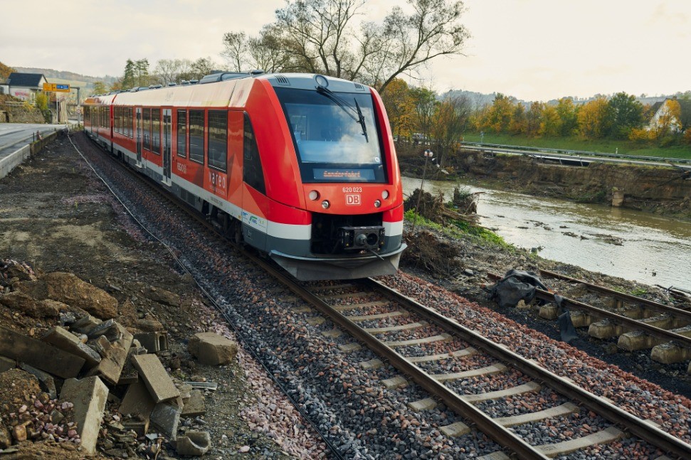 Zwei Mal pro Stunde und Richtung fahren die Züge wieder zwischen Remagen und Ahrweiler. Die Wassermassen hatten die über 110 Jahre alte Ahrtalbahn auf vielen Streckenabschnitten geradezu weggeschwemmt. Besonders betroffen war unter anderem Heimersheim: Hier trug das Wasser den kompletten Bahnsteig davon, zerstörte den Bahndamm auf 1,5 Kilometer Länge und riss mehr als 1,2 Kilometer Gleise aus ihrer Lage. Für den Wiederaufbau der zerstörten Gleise mussten die Fachkräfte der Deutschen Bahn (DB) und Spezialfirmen Tonnen angeschwemmten Schuttes entfernen. Anschließend haben sie Gleise, Bahndämme und Technik repariert und teilweise neu gebaut.