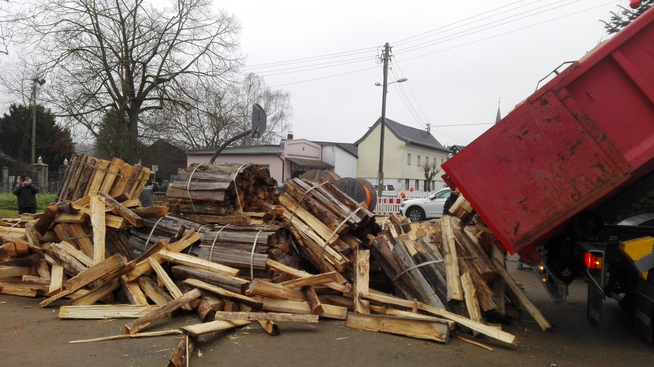 Doch was tun mit 16 Raummeter Holz in großen Stücken? Hier zeigte sich wieder der unglaubliche Zusammenhalt der Schweinheimer Dorfgemeinschaft. Im Nu waren drei mobile Sägestationen organisiert und alle packten mit an. Das handliche Brennholz wurde in Schubkarren und Anhängern an die Haushalte verteilt.