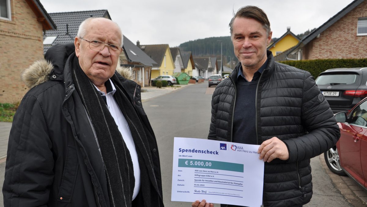 Eine der letzten Flutopfer-Spenden in Höhe von 5000 Euro übergab jetzt der Spendenpate Markus Willmes vom Verein „AXA von Herz zu Herz e.V.“ an Flutopfer-Helfer Dieter Züll von der Hilfsgruppe Eifel. Die Übergabe erfolgte in Kall, wo die Hilfsgruppe in den letzten Monaten  zahlreiche Flutopfer mit Soforthilfen unterstützt hat.