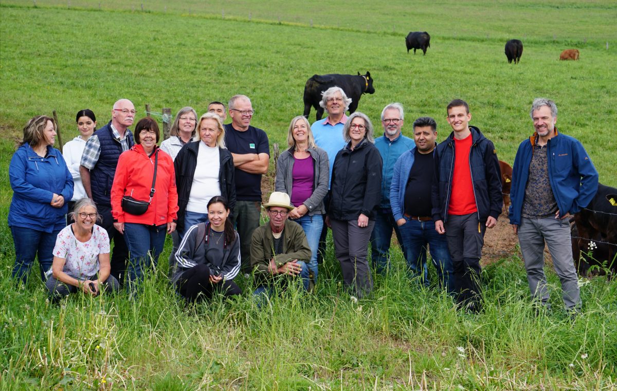 Begonnen hat dieser wunderbare Tag voller Eindrücke und Gespräche an der Duppacher Hütte. Organisator Uwe Rahn und Sprecher Tim Steen vom Vorstand des GRÜNEN Ortsverbandes Kylltal nahmen die Gäste von der Ahr an der Hütte in Empfang. Dort gab es eine sehr anschauliche und unterhaltsame Erläuterung von Norbert Meyer zu seinen Angusrindern. Die Beweidung durch seine Herden sorgt für biologische Vielfalt, bildlich dargestellt am Werdegang eines Kuhfladens. Beim Besuch seiner Tiere auf der Weide präsentierte sich eine ökologische Idylle.