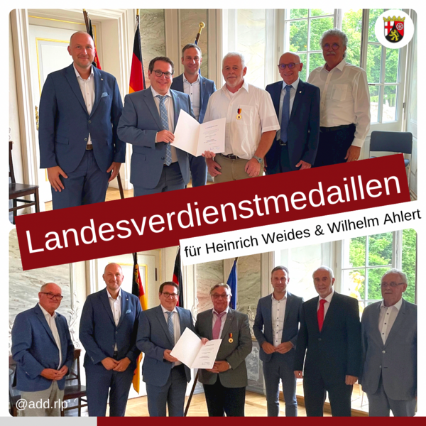 Bitburg/Trier – Thomas Linnertz, Präsident der Aufsichts- und Dienstleistungsdirektion (ADD) überreichte heute in Trier Wilhelm Ahlert und Heinrich Weides in Würdigung ihrer langjährigen sozialen Verdienste die Verdienstmedaille des Landes Rheinland-Pfalz.