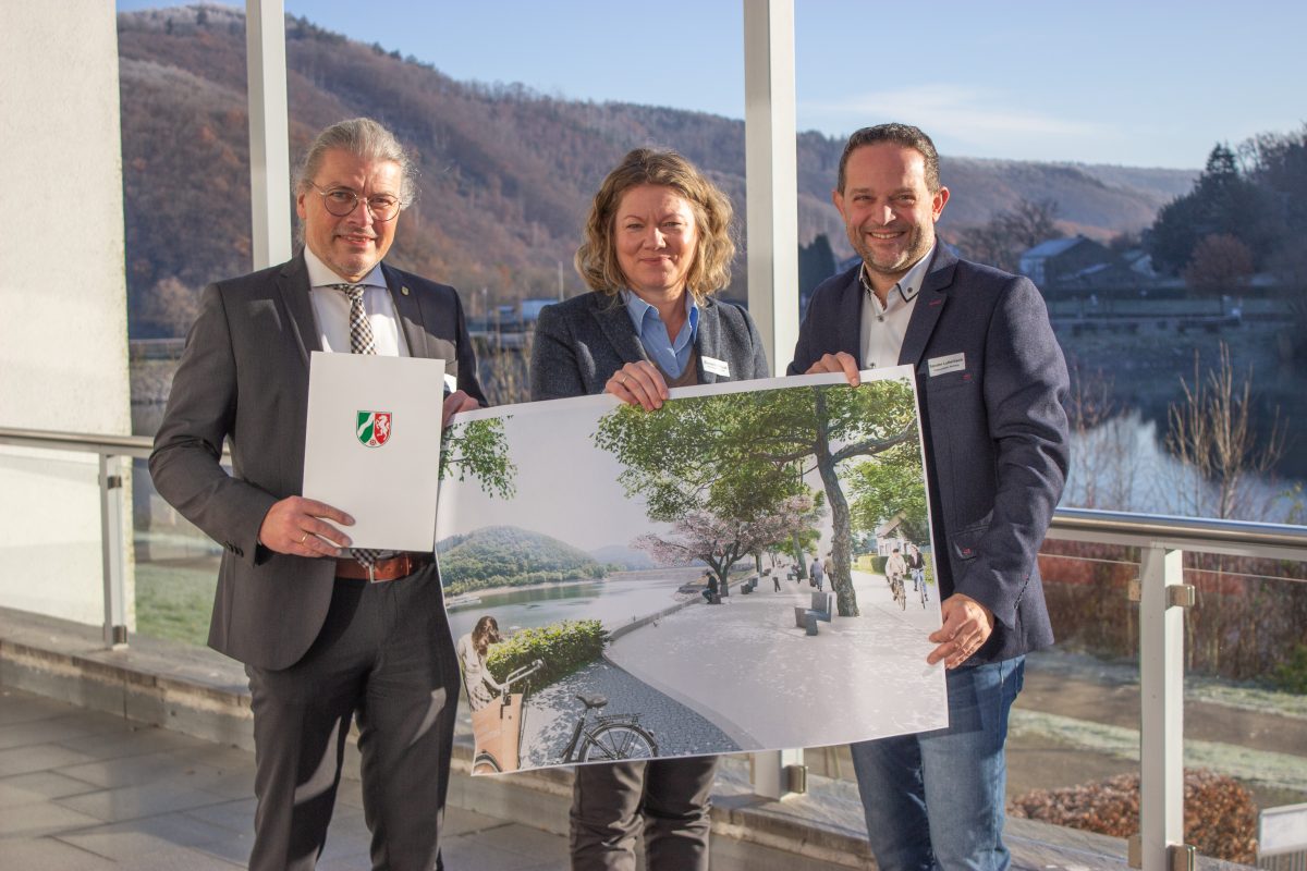 Simmerath – Förderbescheid über fast 4,9 Millionen Euro für die Umgestaltung der Rurseepromenade in Rurberg jetzt offiziell übergeben. Dass die Förderung für die Umgestaltung und Weiterentwicklung der Rurseepromenade („Weiterentwicklung der touristischen Infrastruktur in Rurberg“) bewilligt ist, war bereits bekannt. Jetzt wurde der Förderbescheid für das RWP-Projekt (Projekt des Regionalen Wirtschaftsförderungsprogrammes des Landes Nordrhein-Westfalen) vor Ort von Vertreterinnen und Vertretern der Bezirksregierung Köln offiziell an Bürgermeister Bernd Goffart übergeben.