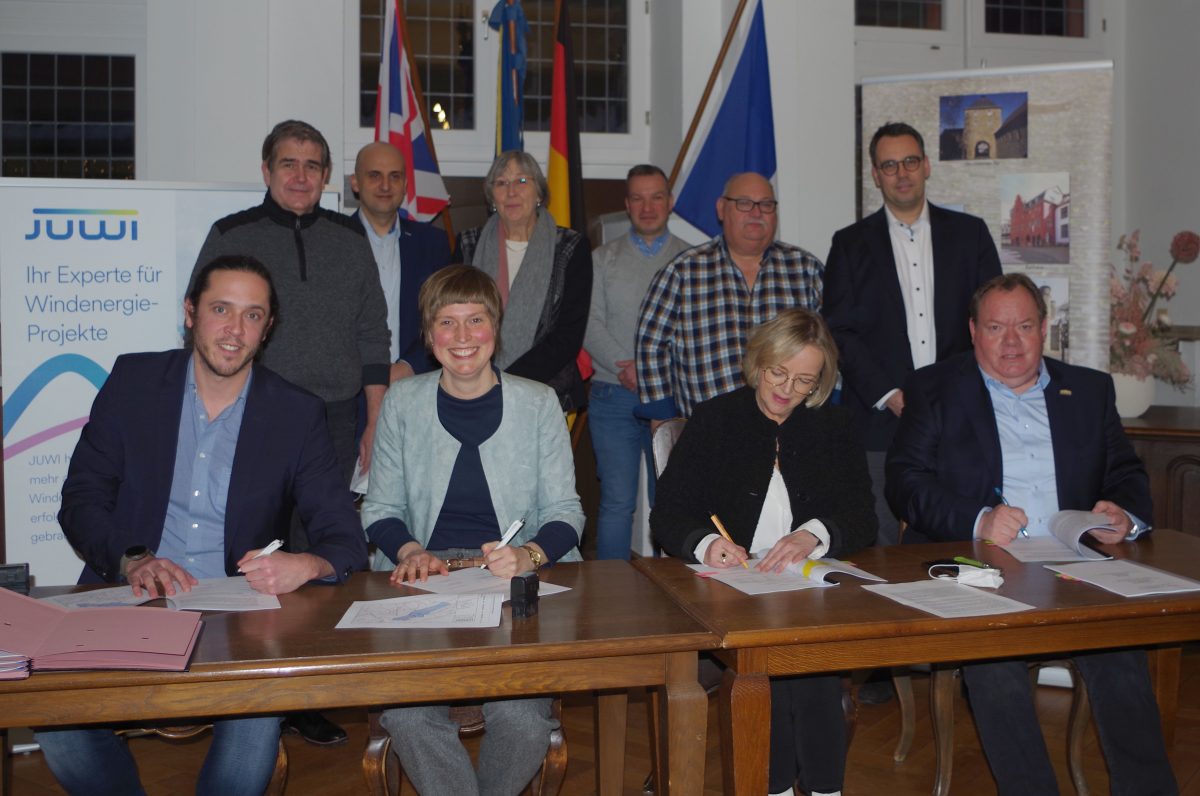 Bad Münstereifel – Die beiden Vertragsparteien schaffen die Grundlage für den geplanten Windpark zwischen Bad Münstereifel-Nöthen und Hohn. Die JUWI Gruppe plant auf vorgeschädigten Forstflächen der Stadt Bad Münstereifel den Bau von zwei Windenergie-Anlagen.