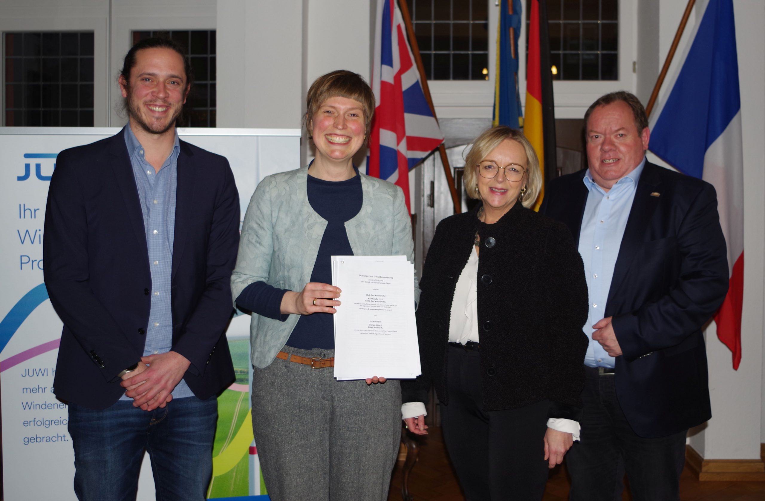Große Freude über die Vertragsunterzeichnung empfanden Sebastian Brockes (Leiter Akquisition West bei JUWI) (v.l.), Federica Pelzer (Projektleiterin JUWI), Bürgermeisterin Sabine Preiser-Marian und ihr Allgemeiner Vertreter Kurt Reidenbach.