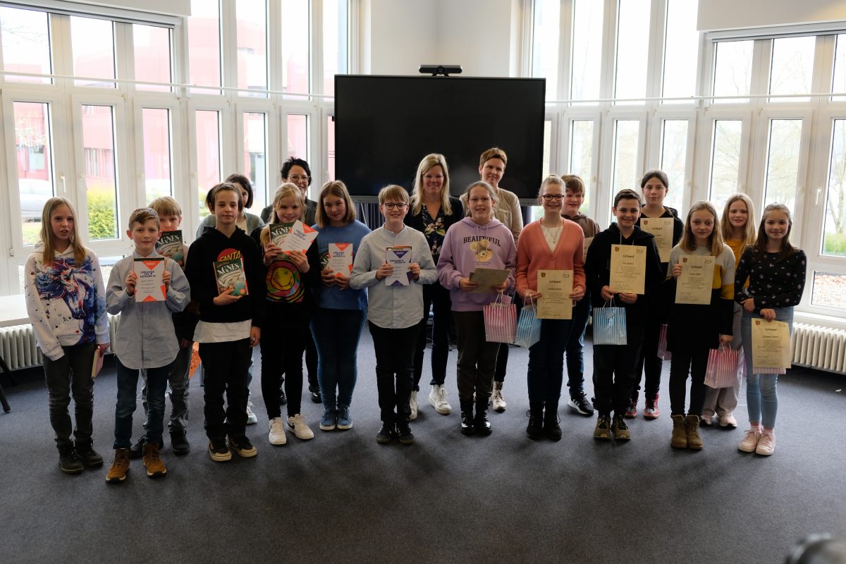 Landrätin Julia Gieseking würdigte die Leistung aller Teilnehmerinnen und Teilnehmer: „Lesen eröffnet wichtige Zugänge zu Fantasie, Bildung und Wissen. Ich freue mich, dass heute so viele Kinder beim Vorlesewettbewerb teilgenommen haben. Ihr alle seid bereits Sieger, denn Ihr seid als beste Vorleser Eurer Schule hier heute angetreten. Dir lieber Pepe Clasen gratuliere ich ganz herzlich zum heutigen Sieg und wünsche dir viel Erfolg bei dem nun anstehenden Bezirksentscheid“.