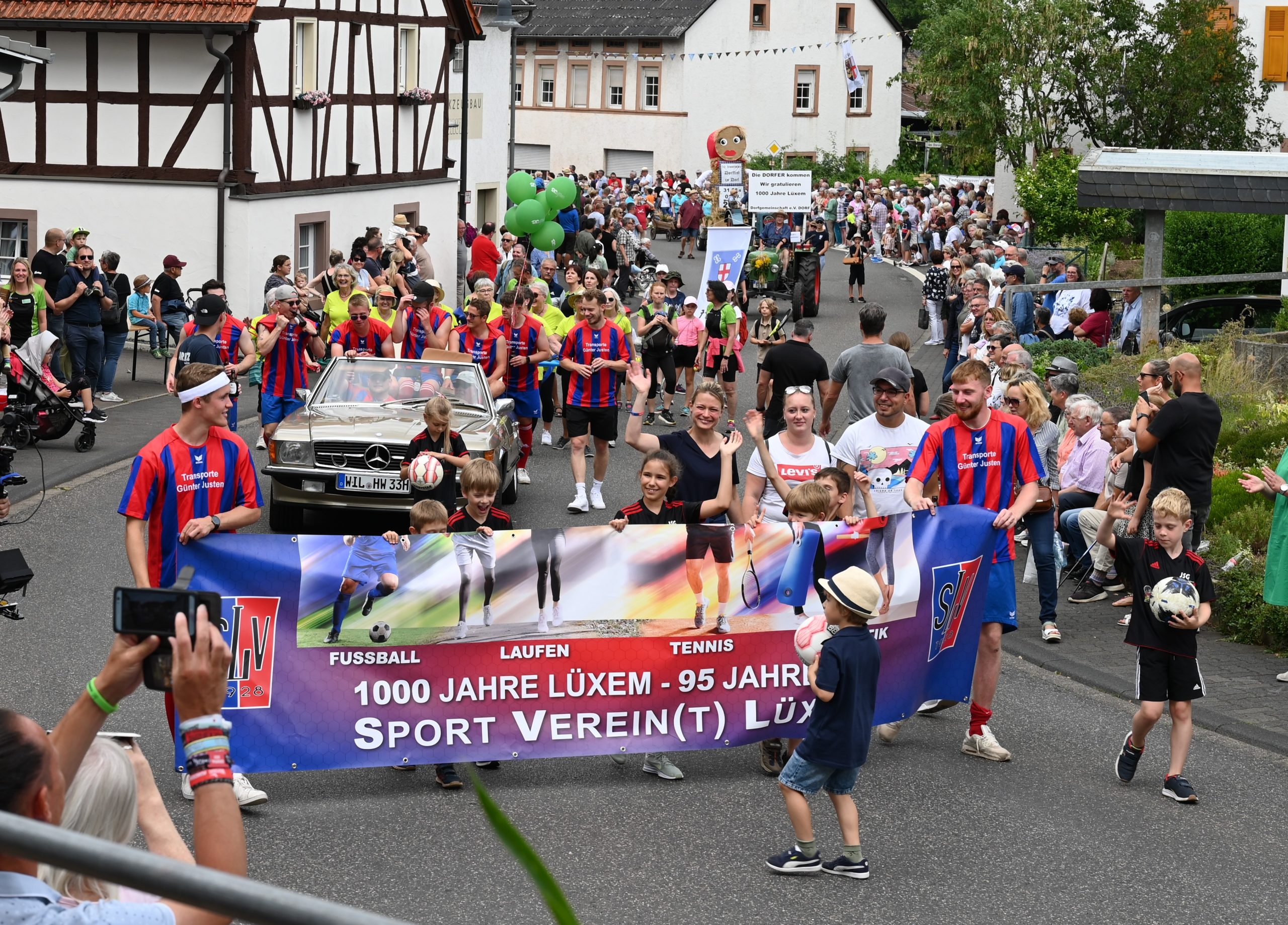 Höhepunkt des Wochenendes war der Große Festumzug, an dem sich ca. 650 Aktive in 33 Gruppen beteiligten. Geschätzt 2.500 bis 3.000 Menschen säumten die Straßen und sahen unter anderem Lüxemer Familien, die ihre Ahnen aufleben ließen, Lüxemer Vereine und tolle Festwagen mit örtlichem Bezug. Jung und Alt waren vertreten, von den Kindern der Lüxemer Kita über Jugendgruppen bis hin zu einem Oldtimer mit drei über 90-jährigen, die die „Triumphfahrt“ durch „ihr Lüxem“ sichtlich genossen. Aber auch Gäste aus der näheren und weiteren Region waren vertreten, wie beispielsweise die Schlepperfreunde des ewig rivalisierenden Nachbardorfes Flußbach. Besonders zu erwähnen sind die bekannte Mainzer Ranzengarde und die „Meenzer Schwellköpp“, deren Träger angesichts 25kg „Kopfgewicht“ bei sommerlichen Temperaturen viel Respekt zuteilwurde. Moderiert wurde der Festumzug vom ebenfalls aus dem Mainzer Karneval bekannten Dr. Florian Sitte sowie Dr. René Pschierer und Dr. Herbert Hoffmann.