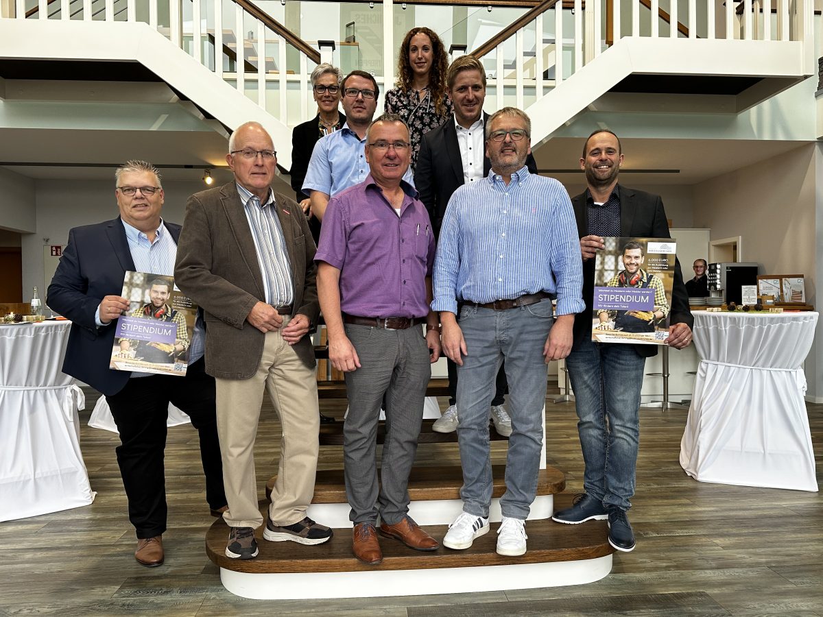 Zu den Details des Stipendiums informierte der Landrat am Donnerstag gemeinsam mit Iris Poth, Leiterin der Stabstelle Wirtschaftsförderung beim Kreis Euskirchen, Kreishandwerksmeister Willi Fetten, Jochen Kupp (Leiter BZE) und dem Schulleiter am Berufskollege Eifel Holger Mohr beim Betrieb Treppen Jenniches in Blankenheim.