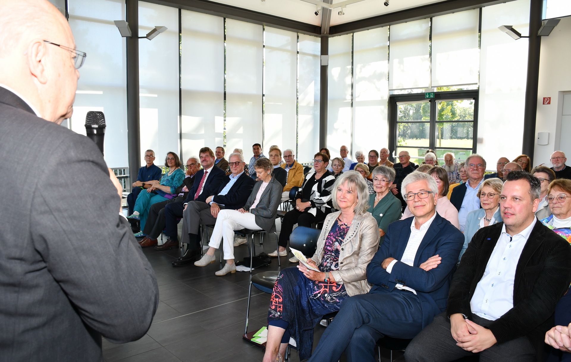Vorsitzender Heinz-Otto Koch eröffnet die Jubiläumsmatinee zum 25jährigen Bestehen des Vereins der Freunde und Förderer des Industriemuseums „Tuchfabrik Müller“, in der ersten Reihe von rechts Bürgermeister Sacha Reichelt, Dr. Walter Hauser, LVR-Direktor der sieben Industriemuseen in Oberhausen (2), Ratingen, Solingen, Bergisch-Gladbach, Engelskirchen und Euskirchen-Kuchenheim, Claudia Meixner, die Vorsitzende des Mandolinenorchesters Kuchenheim, Dr. Maria Regina Neft, die Stellvertreterin Kochs, Wolfgang Picard, Revisor seit der Gründung, Schatzmeister Karl-Heinz Daniels, stellvertretender Vorsitzender Dr. Reinhold Weitz, Beisitzerin Nadja Hügle-Ginster und Homepage-Redakteur Dieter Kabatnik. Foto: Manfred Lang/pp/Agentur ProfiPress