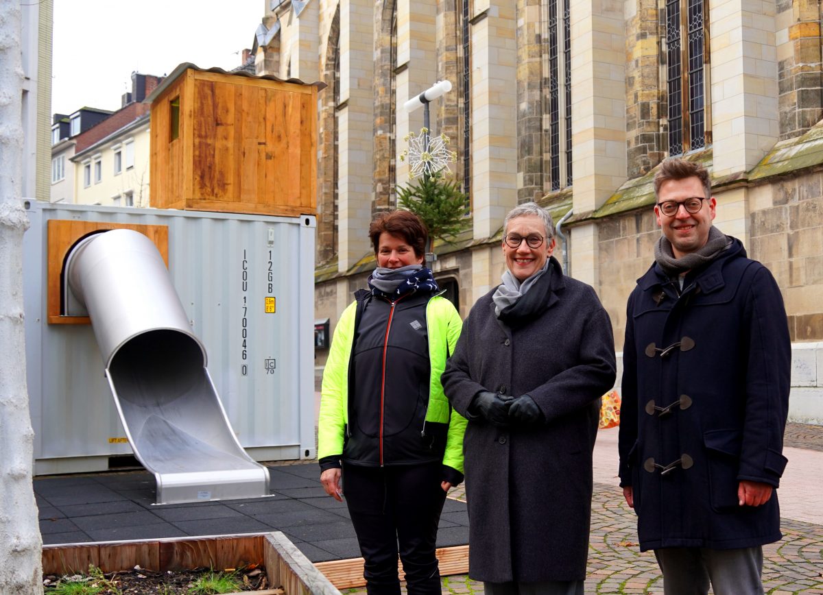 „Unser Auftrag ist es, Spielmöglichkeiten in die Stadt zu bringen. Dieses Container-Projekt ist simpel und effektiv zugleich. In anderen Städten werden Angebote wie dieses schon genutzt und kommen bei den Menschen gut an“, erläuterte Esther Weirauch vom städtischen Fachbereich Klima und Umwelt. Der ehemalige Seecontainer, der auf dem Platz vor der Citykirche steht, wurde in einen wunderbaren kleinen Spielort samt Röhrenrutsche verwandelt. Innen können kleine Besucher*innen durch Kletterelemente aus Holz das Dach erklimmen, auf dem sich ein kleiner Ausguck mit Fenstern befindet. Außerdem gibt es im Container verschiedene Aufstiegs- und Sitzpodeste, um kurz mal beim Spielen zu verschnaufen. Zusätzliche Kletterstangen werden in den nächsten Tagen noch ergänzt, um zu garantieren, dass der neue Spielpunkt nicht als Liegefläche genutzt wird. Zudem gibt es bereits Überlegungen, dass der Container im kommenden Jahr in einem gemeinsamen Projekt mit Kindern und Jugendlichen farblich gestaltet wird.