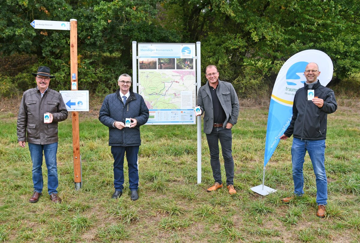 Region/Kreis MYK, 06.10.2020 – Vier neue Traumpfädchen wanderbar. Endlich sind sie fertig, die vier neuen Traumpfädchen im Traumpfade-Land Mayen-Koblenz. Rhein-Mosel-Eifel-Touristik (REMET) – Verbandsvorsteher Landrat Dr. Alexander Saftig konnte symbolisch für alle vier Wege die Portaltafel am Traumpfädchen Mendiger Römerreich enthüllen und für die Wanderer frei geben. In den vergangenen Wochen und Monaten wurde eifrig geschraubt, gesprüht, gehämmert und gebohrt. Gemeinsam mit vielen Fachfirmen sowie den Gemeinden, Verbandsgemeinden und Städten kann die REMET den vielen Wanderern nun ein Wanderangebot aus 14 Traumpfädchen sowie 26 Traumpfaden und dem Themenweg Streuobstwiesenweg anbieten.