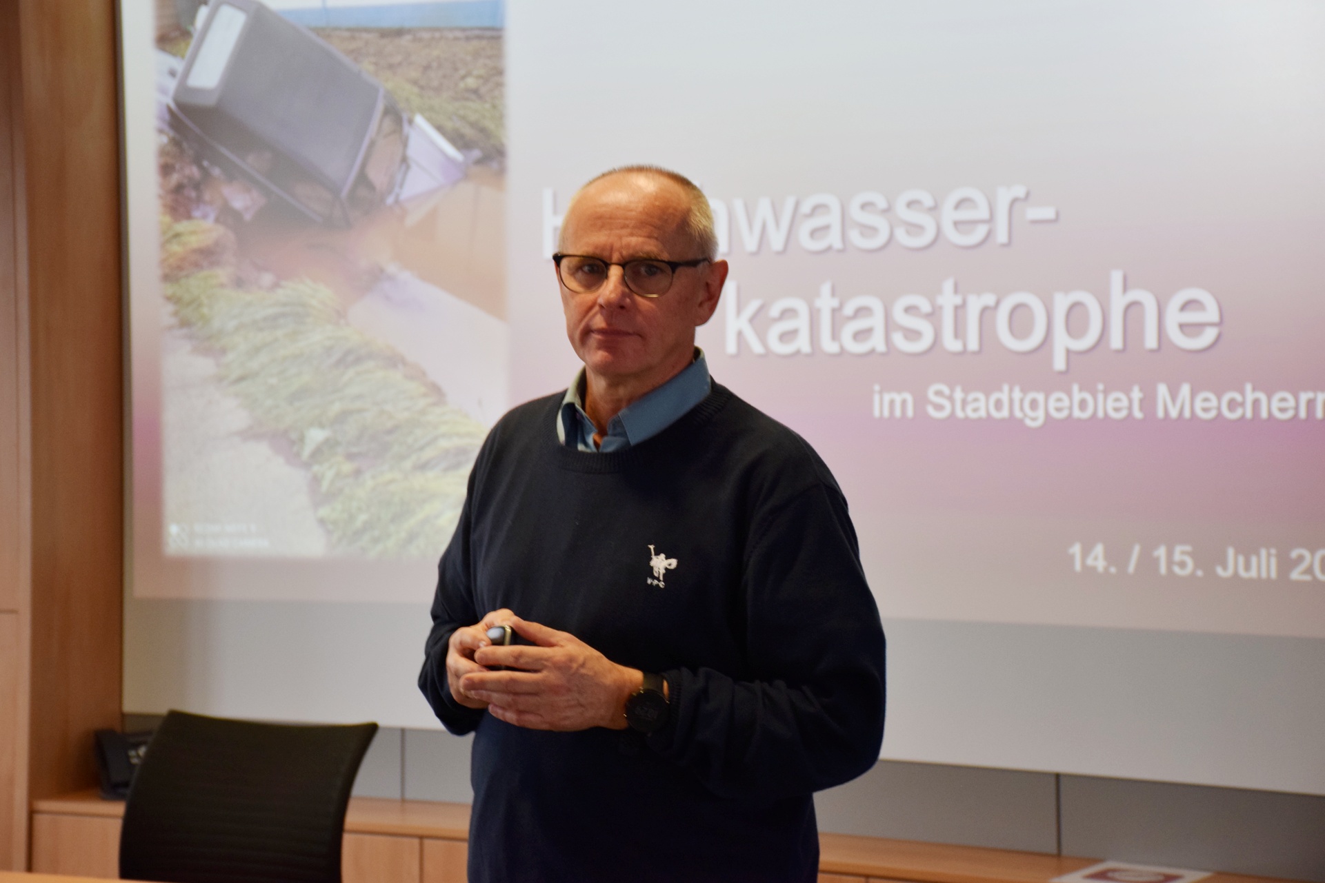 Um ein Bild der Fluten und Schäden im Stadtgebiet zu vermitteln, wurden den Gästen aus Nyons im Ratssaal Fotos und Videos gezeigt. Ralf Claßen berichtete: „In Mechernich gibt es 44 Ortschaften, 38 waren mehr oder weniger betroffen. Wir hatten über 2.000 Haushalte – von rund 12.000 – die einen Flutschaden hatten.“ Die Schäden an der städtischen Infrastruktur bezifferte Ralf Claßen auf 15 Millionen Euro. Zehntausende Tonnen von Schutt die Bilanz am Ende.
