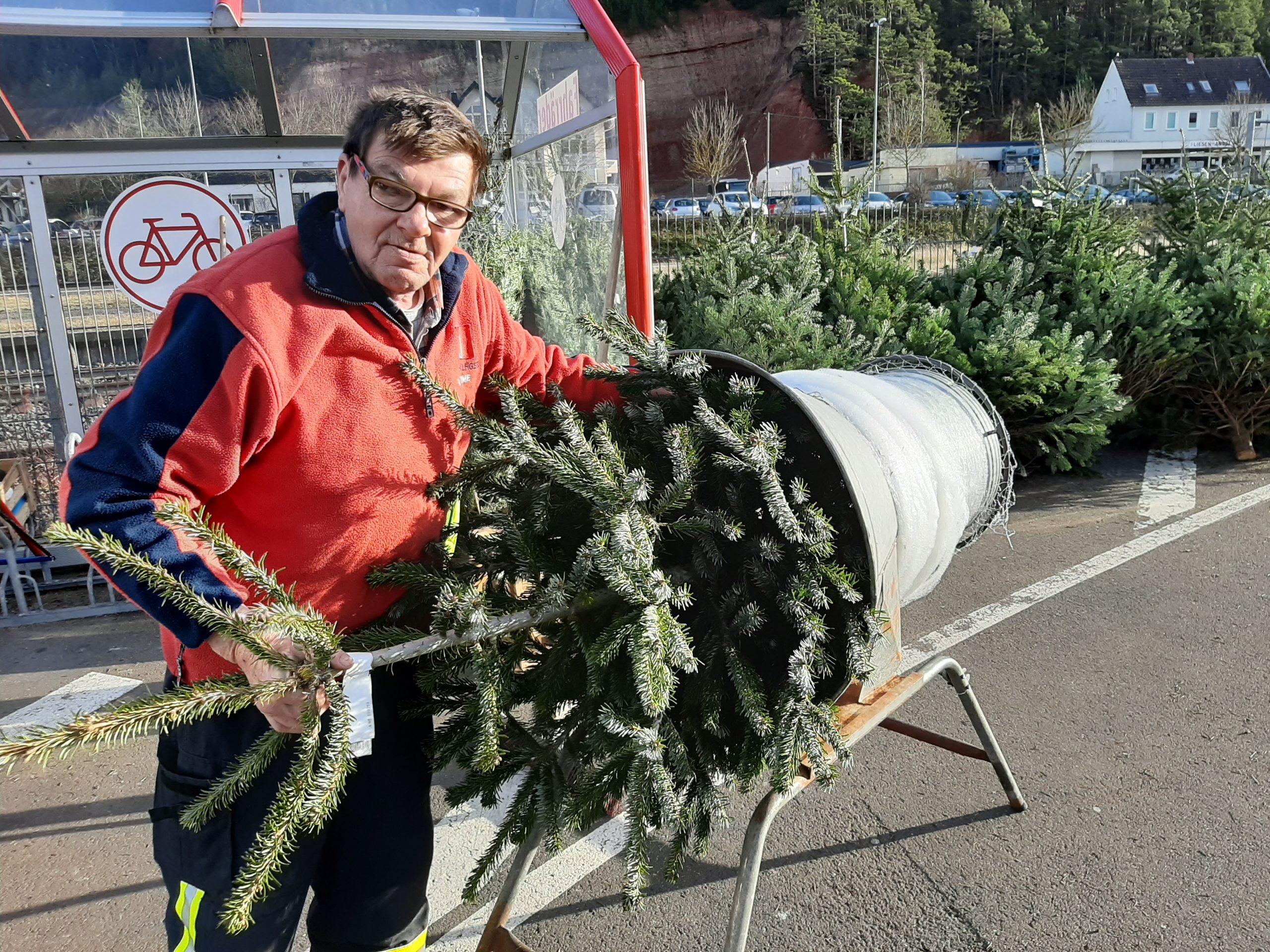 Rentner Ekkehard Scholz verkauft seit vier Jahren ehrenamtlich die Weihnachtsbäume der Hilfsgruppe Eifel. Foto: Reiner Züll