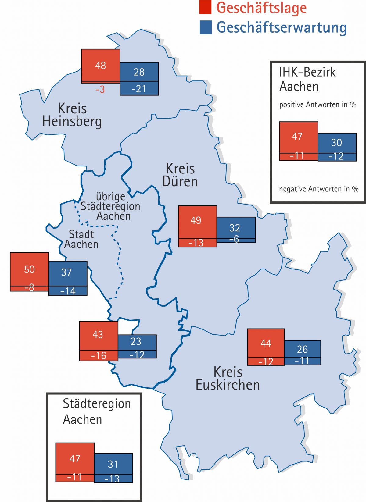 Die Geschäfte der Unternehmen in der Stadt Aachen sind seit dem Frühjahr deutlich angezogen. 50 Prozent aller Betriebe melden eine gute Geschäftslage, nur 8 Prozent sind nicht zufrieden. Gut geht es vor allem dem Einzelhandel (Saldo: +63) und dem Baugewerbe (Saldo: +61). Die Unternehmen bleiben dabei zuversichtlich. 37 Prozent der Befragten rechnen mit einer positiven Entwicklung, 14 Prozent mit einer negativen. Positive Aussichten haben vor allem das Baugewerbe (Saldo: +31), die Industrie (Saldo: +30) und die Dienstleister (Saldo: +30).