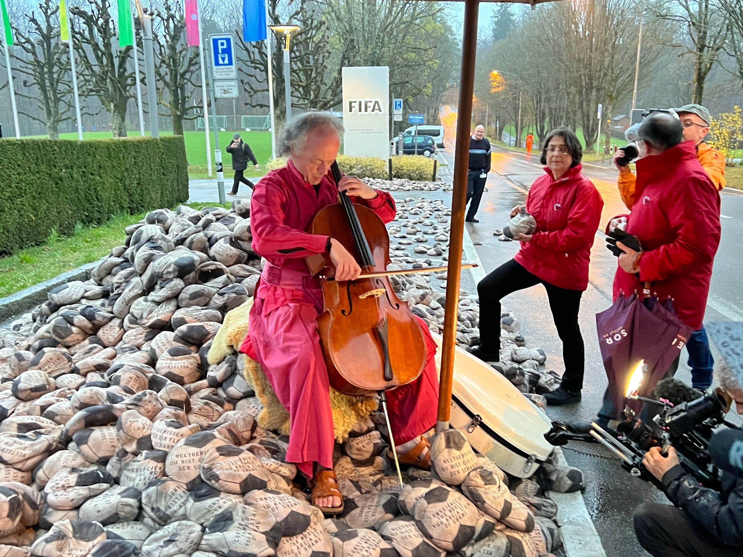Vor der FIFA-Zentrale in Zürich appellieren ein Künstler und die Arbeiter-Wohlfahrt ans Weltgewissen