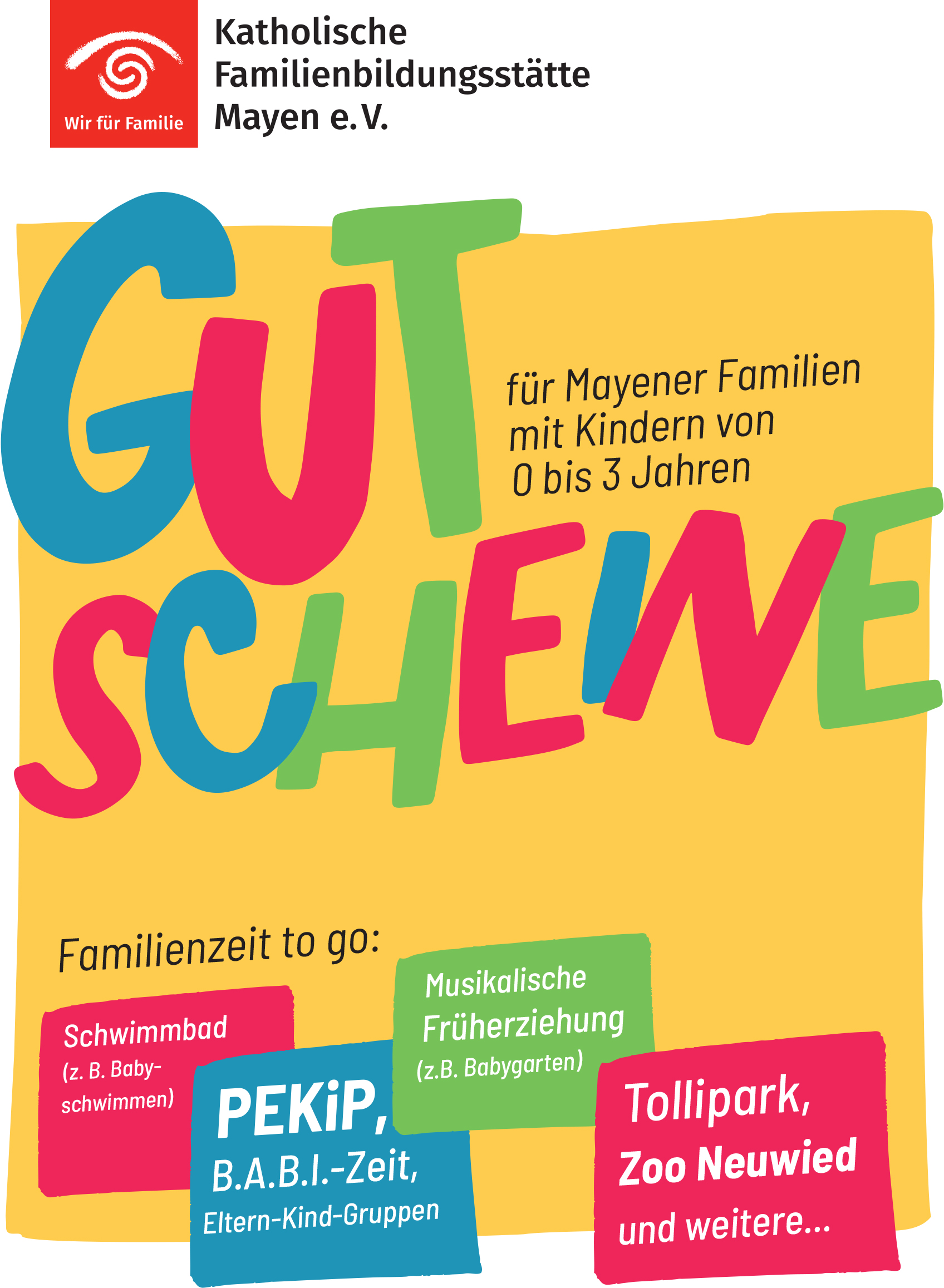 Mayen – Familien können sich ab sofort bei der Familienbildungsstätte Mayen, Bäckerstraße 12, Gutscheine für unterschiedliche Freizeitaktivitäten abholen. So gibt es z.B. Gutscheine für den Zoo Neuwied, Tollipark, Schwimmbad, PEKiP…