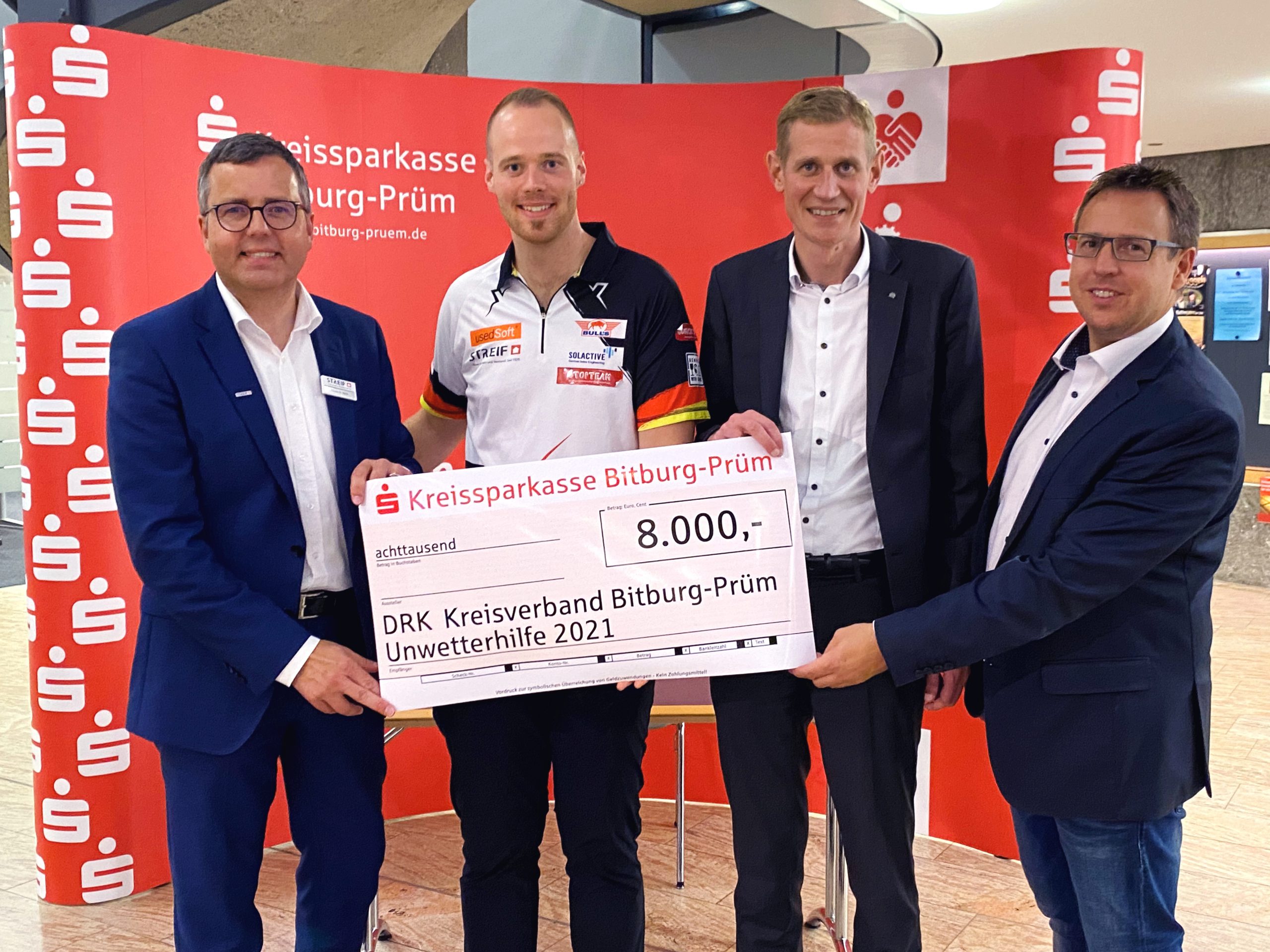 Kreissparkasse Bitburg-Prüm, Dart-Star Max Hopp, Streif Haus GmbH und Bebado spenden gemeinsam mehr als 8.000 € zugunsten der Flutopfer im Eifelkreis Bitburg-Prüm