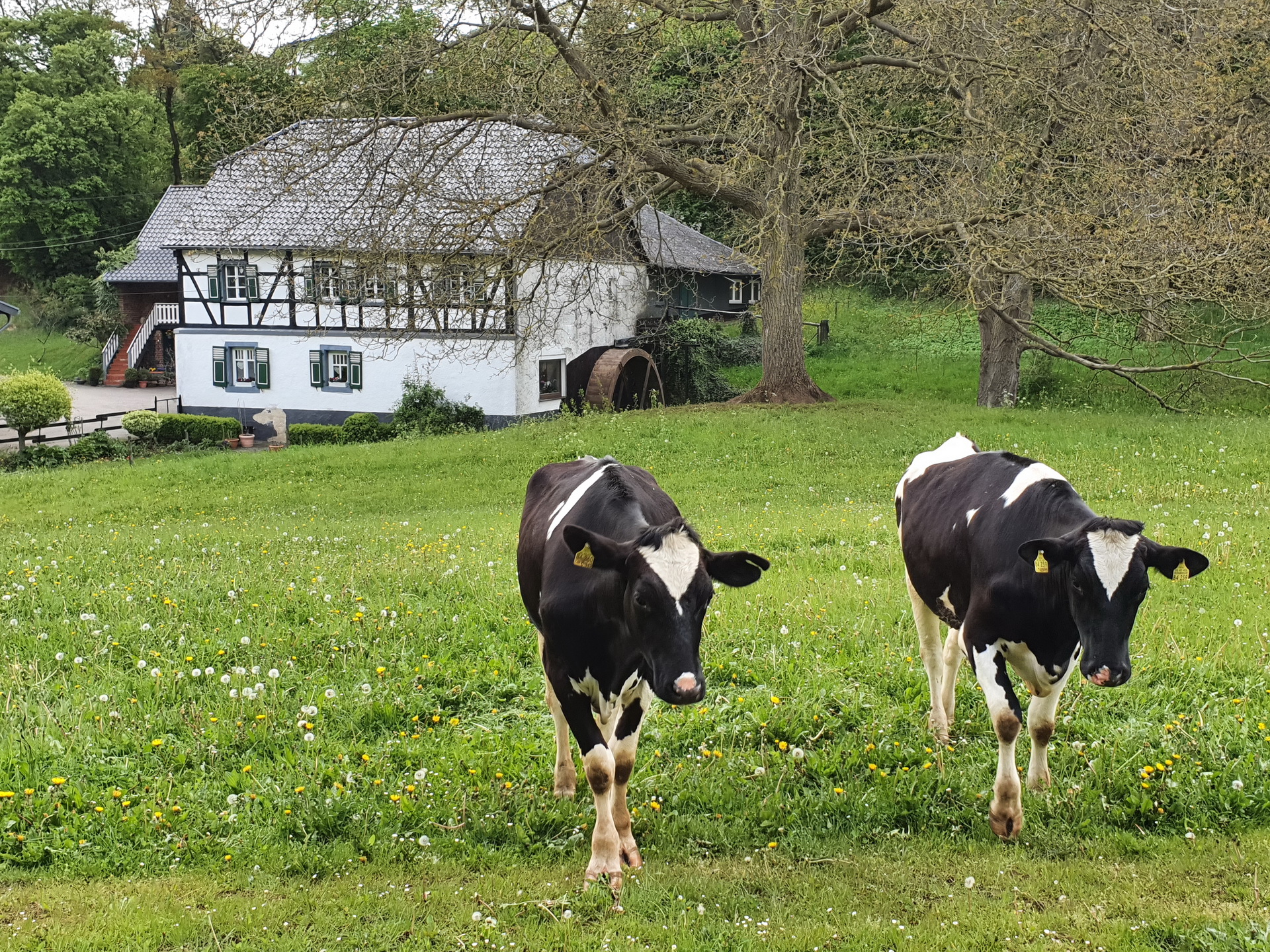 Mechernich-Vollem – Blühender Flieder und neugierige Rinder vor der 270 Jahre alten voll funktionsfähigen Vollemer Mühle. Zwei neugierige Rinder vor der alt-ehrwürdigen Vollemer Mühle an einem ganz normalen Werktagmorgen, Donnerstag,…