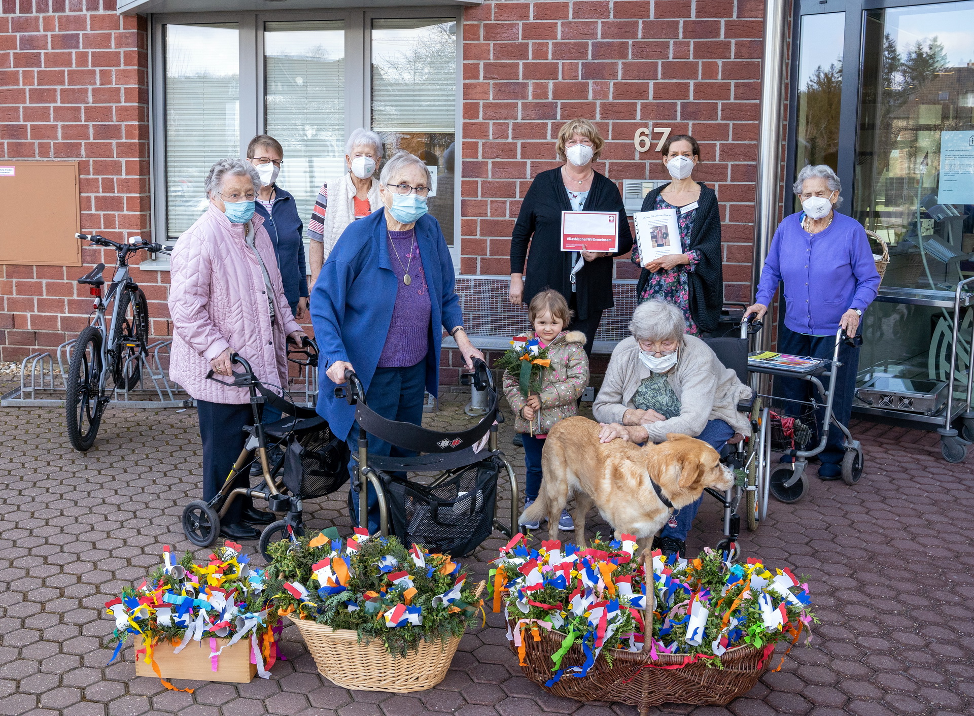 Mechernich, 30.03.2021 – Einhundert Palmstangen bastelten die Kinder des katholischen Kindergartens St. Johannes Baptist für die Bewohner/innen des Altenheimes „Kreuserstift“ in Mechernich. „Pänz“ und Erzieherinnen überreichten die Stecken mit Hühnern…
