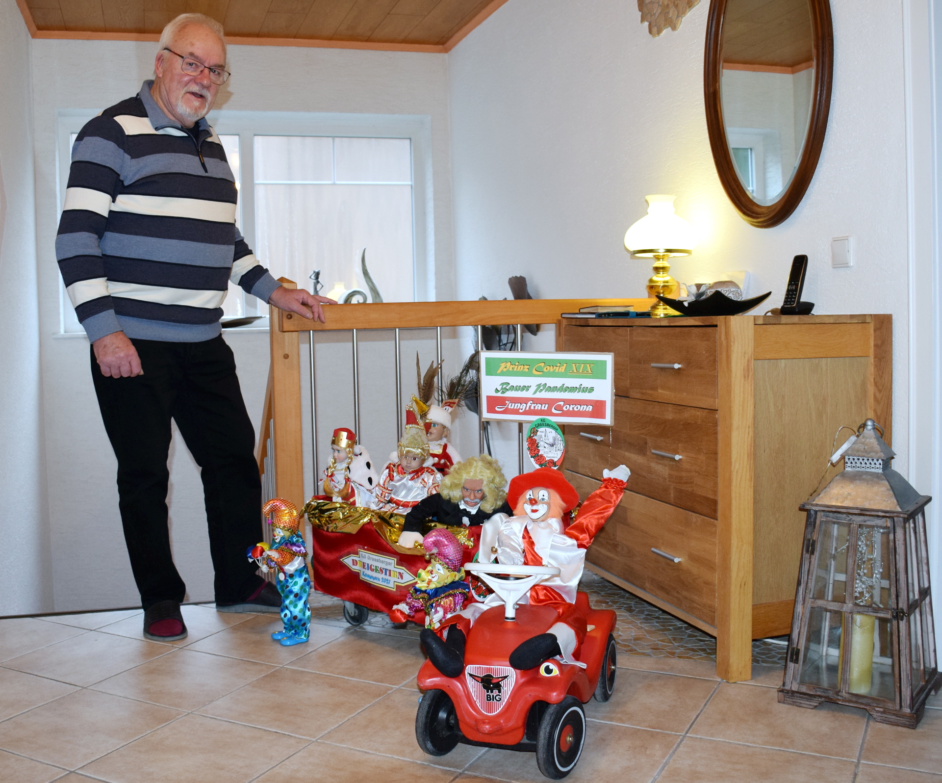 Kommern/Katzvey, 05.02.2021 – Prinz Covid-XIX, Bauer Pandemius und Jungfrau Corona haben im Karnevalswagen der KG Greesberger aus Kommern Platz genommen. Hans Süper, der legendäre rheinische Karnevalsbarde und „Flitsch“-Mandolinen-Zupfer im Colonia-Duett,…
