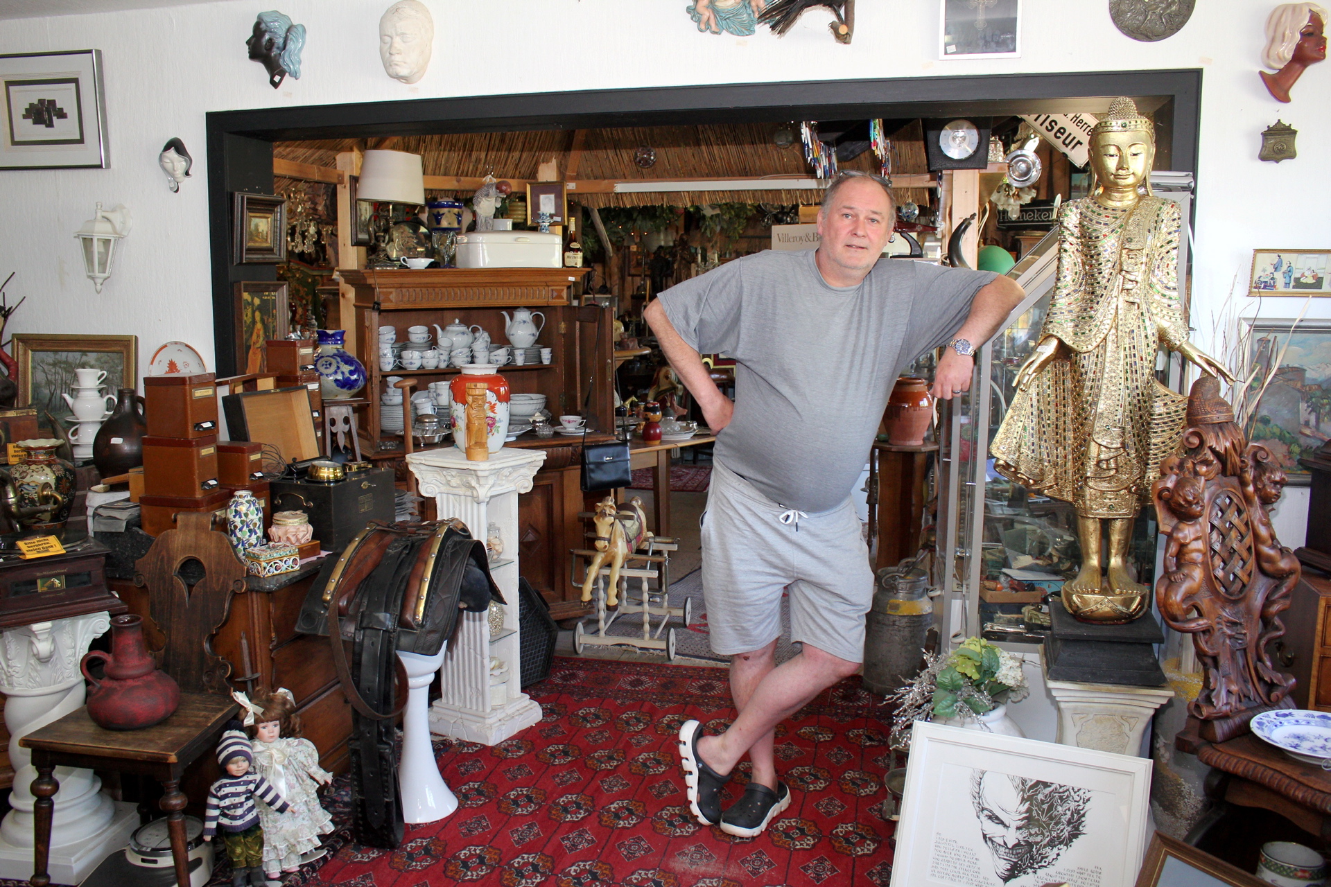 Kall-Krekel, 01.09.2020 – Walter Lehnertz sitzt im Eingangsbereich seines Antiquitätenladens „Eifel Antik“ in Krekel. Es ist viel los. Kunden schlendern durch den Laden und stöbern zwischen Möbeln, Glaswaren und „Altertümchen“….