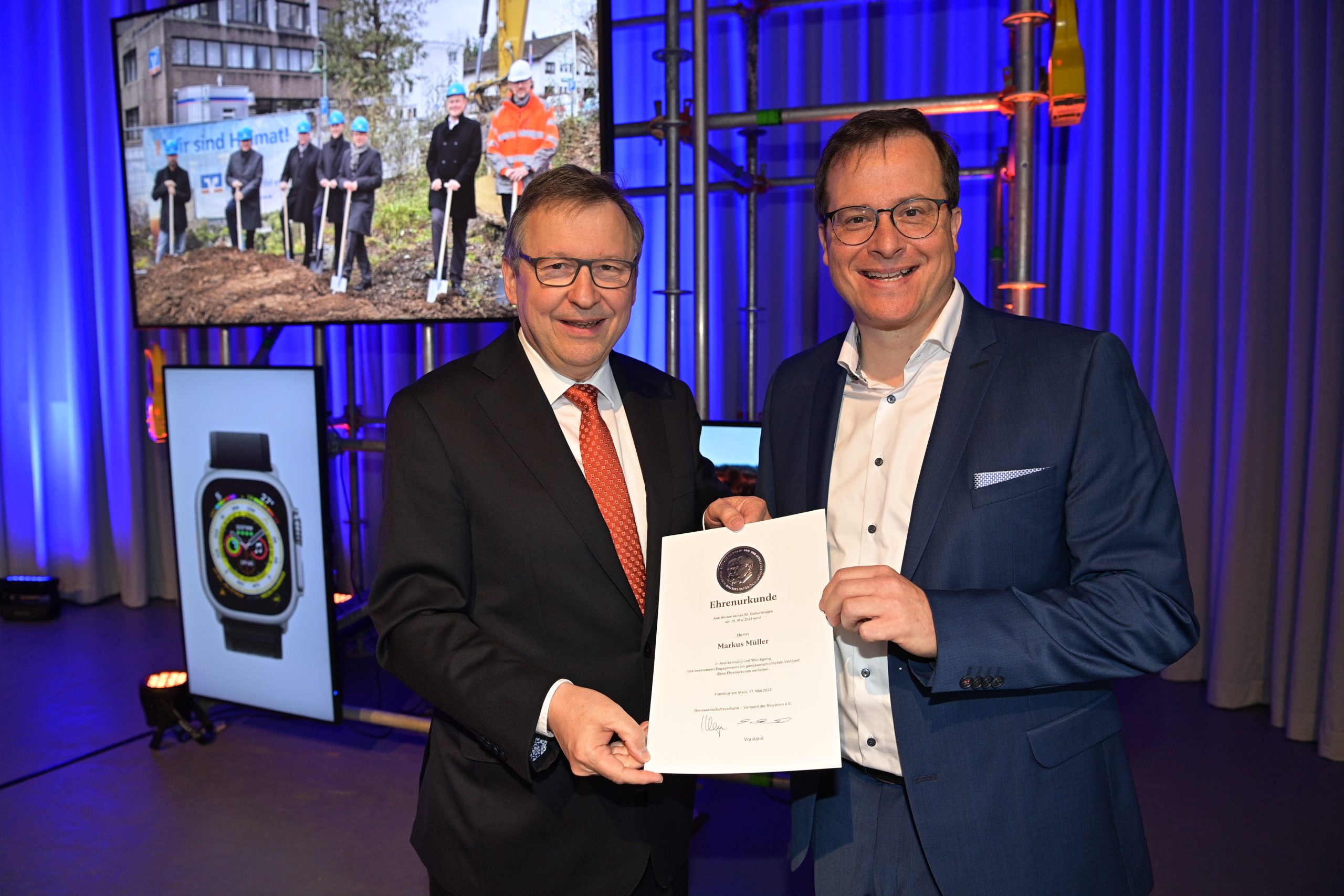Volksbank-Vorstand Markus Müller mit der Ehrenurkunde ausgezeichnet