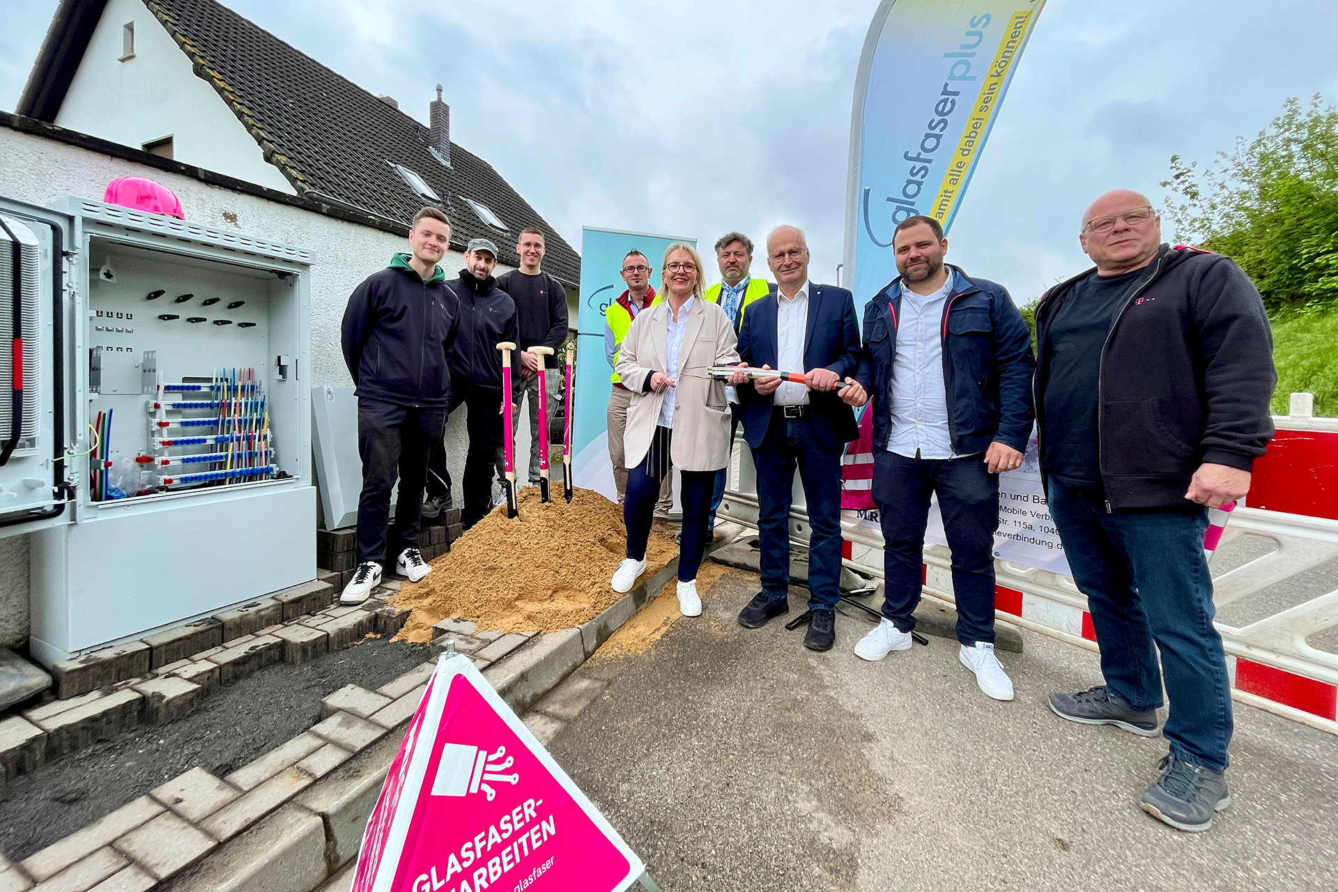 Mechernich-Satzvey – Mechernichs Bürgermeister Dr. Hans-Peter Schick gibt mit Vertretern von GlasfaserPlus, Telekom und der ausführenden Baufirma den offiziellen Startschuss für den Internetausbau in Satzvey, Mechernich und Kommern. Drei magentafarbene…