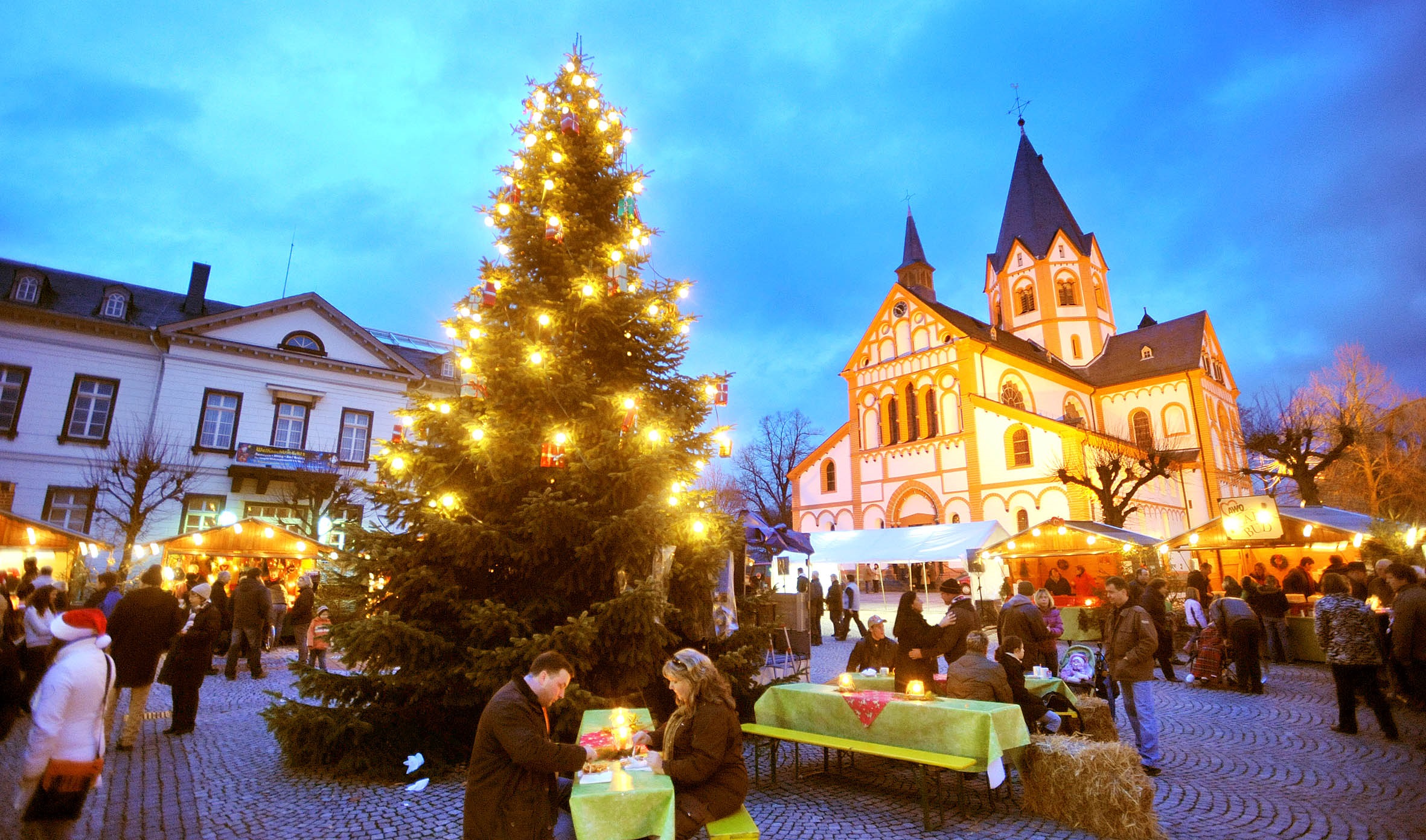 Ahrweiler – Vor der Kulisse der mächtigen Pfarrkirche St. Laurentius und rund um den großen geschmückten Weihnachtsbaum auf dem Marktplatz tummeln sich an allen vier Adventswochenenden lauschige Buden mit duftendem…