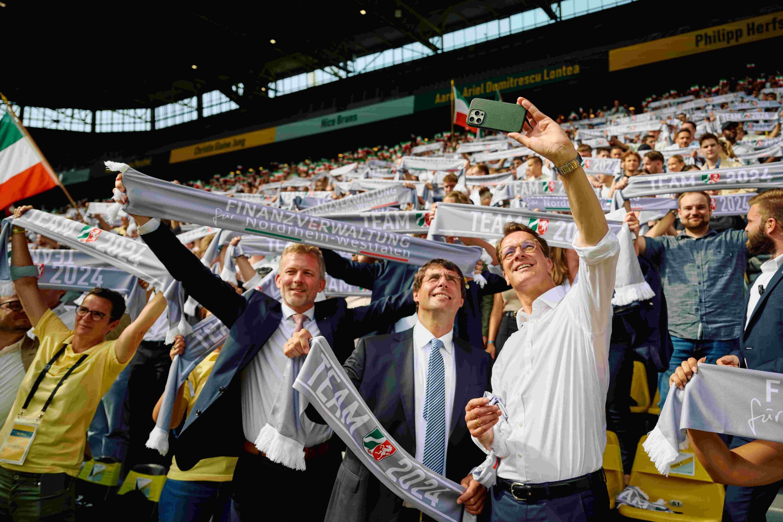 Region/Düsseldorf – Wo sonst die schwarz-gelbe Wand den BVB bejubelt, wurden am gestrigen Dienstag, 03. September 2024 Fanschals und Fahnen mit dem Landeswappen geschwenkt – Ministerpräsident Hendrik Wüst und Minister…